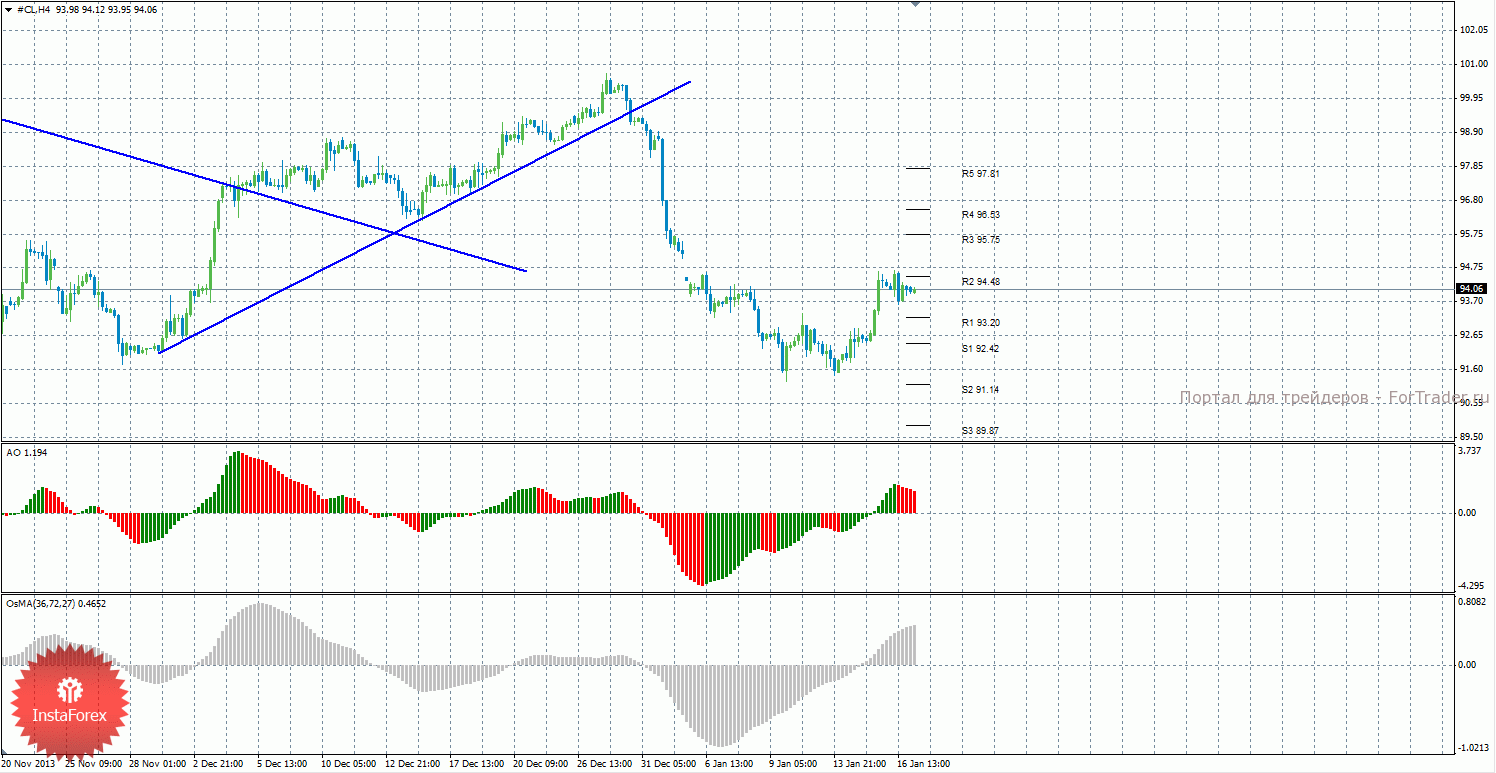 Анализ сырой нефти за 17 января показывает, что цена продолжает корректироваться и закрепилась выше уровня R1 – 93,20, может быть отскок от уровня 94,48. Нисходящее движение может возобновиться с целями R1 – 93,20 и S1 – 92,42, если цена отскочит от уровня 94,48. Может продолжиться восходящая коррекция с целями 95,75 и 96,53, в случае, если цена закрепится выше уровня 94,48. Восходящая линия тренда больше не оказывает поддержку торгующим на повышение, цена закрепилась ниже нее, а тенденция на рынке поменялась на нисходящую. Нисходящей линии тренда пока что нет. Индикатор Awesome показывает текущее нисходящее движение, так как последний закрытый бар красного цвета. OsMA пока что направлен вверх, что говорит о восходящем характере движения в более долгосрочном плане. Отскок от уровня 94,48 может спровоцировать завершение коррекционного движения.