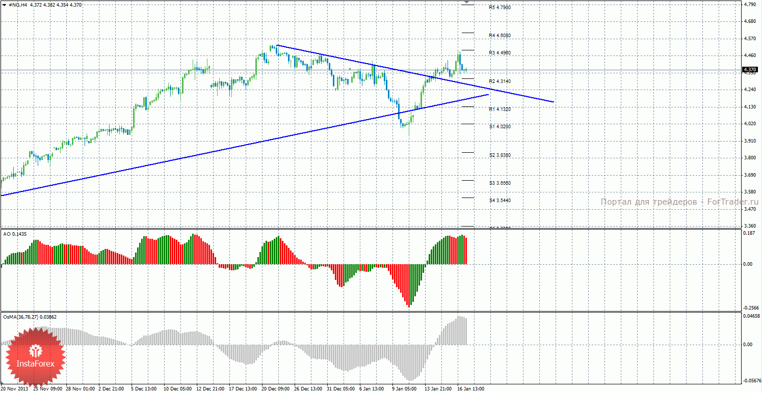 Анализ природного газа за 17 января показывает, что цена отработала уровень сопротивления 4,4960 и отскочила от него, начав нисходящую коррекцию. На данный момент актуально восходящее движение с целями уровни сопротивления R3 — 4,4960 и R4 – 4,6080, если цена отскочит от уровня 4,3140. Целями для возможного продолжения нисходящей коррекции выступают уровни поддержки 4,1320 и 4,0200, если цена закрепится ниже уровня 4,3140. Обе линии тренда на данный момент не актуальны. Индикатор Awesome показывает локальное нисходящее движение, последний закрытый бар окрашен в красный цвет. OsMA также направлен вниз, что сигнализирует о нисходящем движении цены на газ и в более долгосрочной перспективе. Если цена отскочит от уровня 4,3140, это может спровоцировать возобновление восходящего тренда.