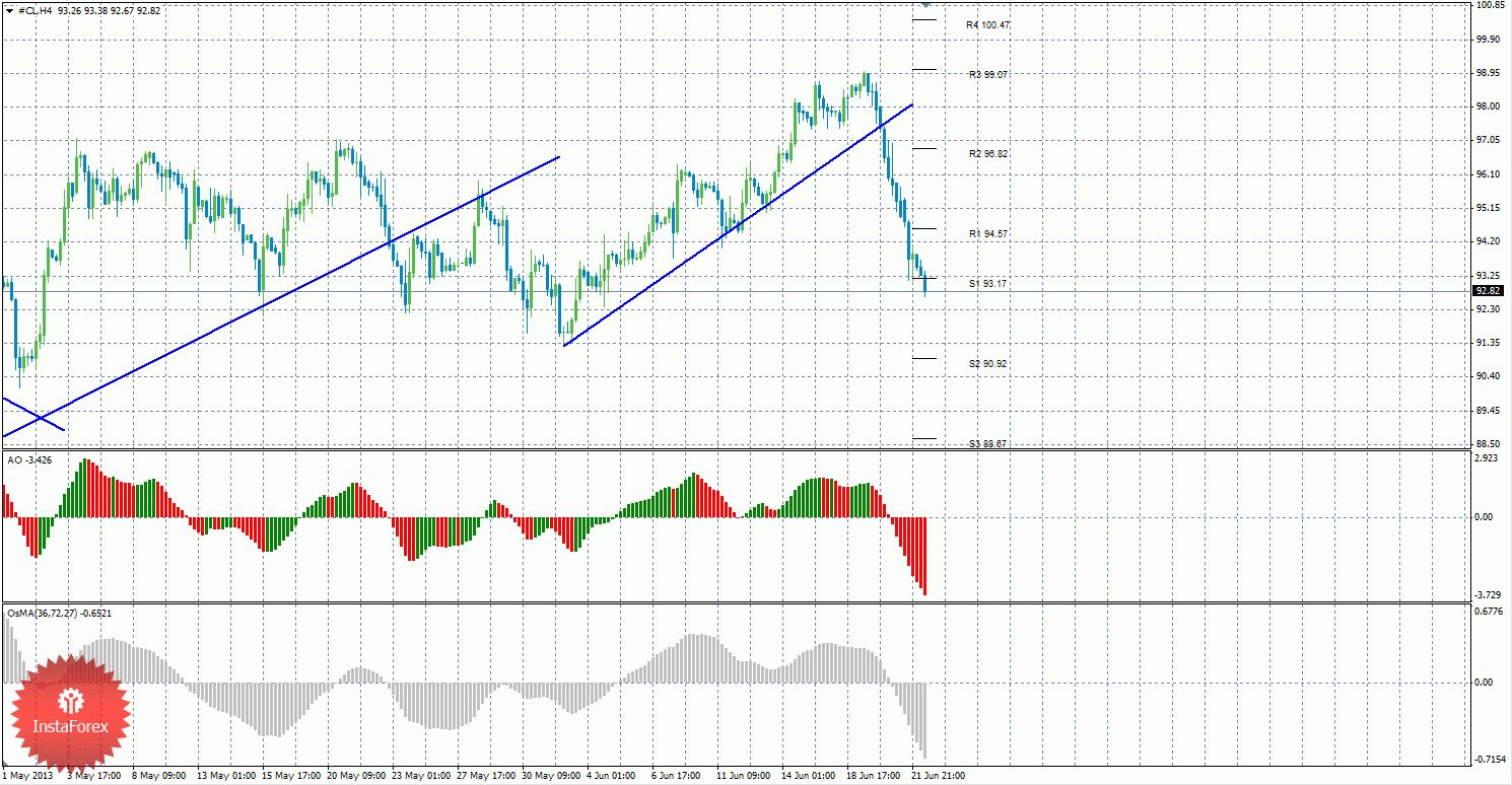 Анализ сырой нефти за 24 июня показывает, что цена продолжает находиться ниже восходящей линии тренда и продолжает нисходящее движение, преодолевая один уровень поддержки за другим. Сейчас актуальны короткие позиции с целями S2 – 90,92 и S3 – 88,67, если цена закрепится ниже уровня 93,17. Может начаться виток восходящего движения с целями 94,57 и 96,82, если цена отскочит от уровня 93,17. Восходящая линия тренда больше не поддерживает торгующих на повышение, так как цена закрепилась ниже нее. Новую нисходящую линию тренда построить на данный момент нельзя. Индикатор Awesome показывает текущее нисходящее движение, так как последний закрытый бар красного цвета. OsMA также направлен вниз, что говорит о нисходящем характере движения и в более долгосрочном плане. Если цена отскочит от уровня S1 – 93,17, это может спровоцировать восходящее коррекционное движение.