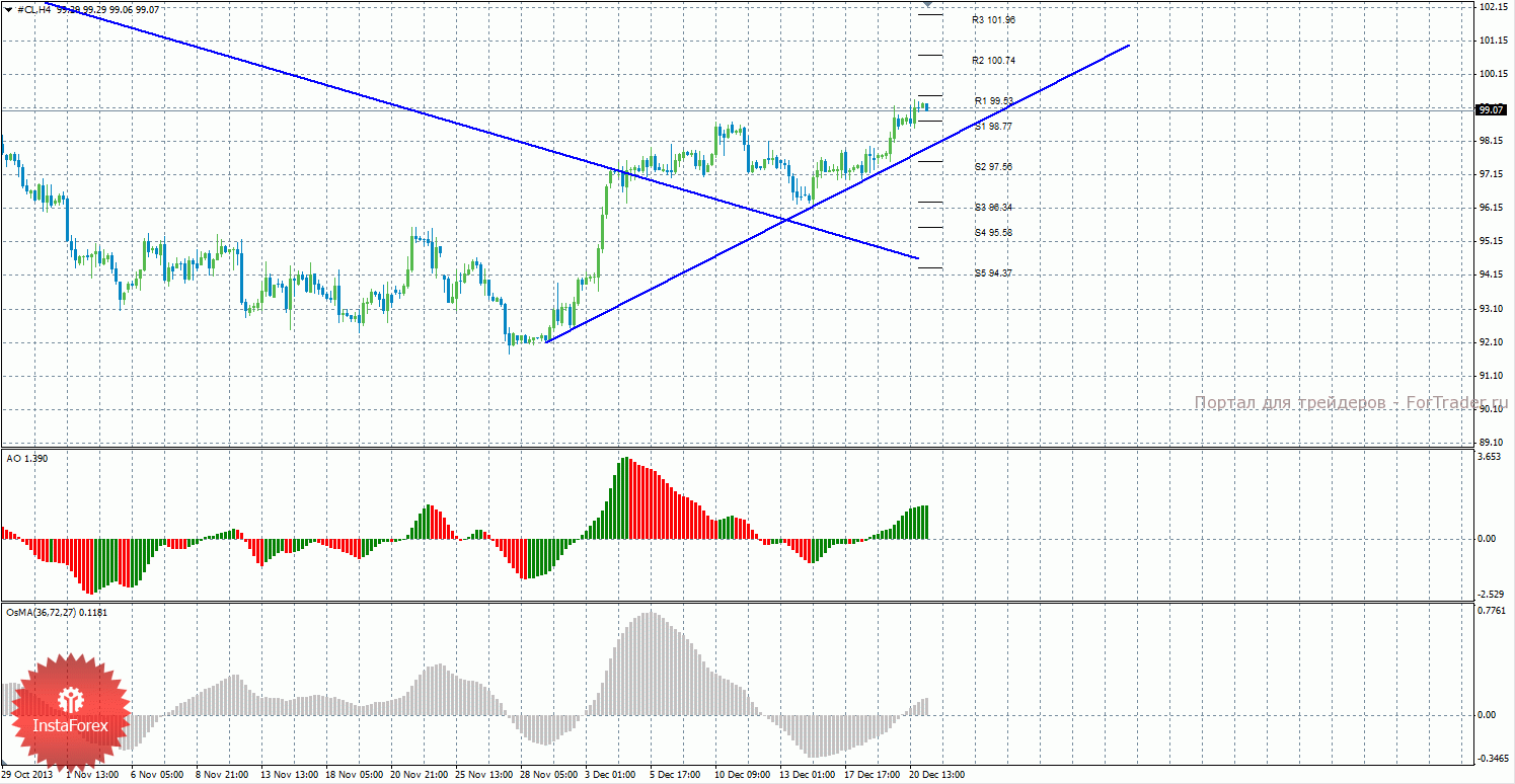 Анализ сырой нефти за 23 декабря показывает, что цена продолжает восходящее движение, но в начале новой недели находится между уровня S1 и R1. Восходящее движение может продолжиться с целями R2 – 100,74 и R3 – 101,96, если цена закрепится выше уровня 99,53. Может начаться новая нисходящая коррекция с целями 97,56 и 96,34, в случае, если цена закрепится ниже уровня 98,77. Построена восходящая линия тренда, которая оказывает поддержку торгующим на повышение. Индикатор Awesome показывает текущее восходящее движение, так как последний закрытый бар зеленого цвета. OsMA также направлен вверх, что говорит о восходящем характере движения и в более долгосрочном плане. Если цена закрепится ниже уровня 98,77, это может спровоцировать виток коррекционного движения.