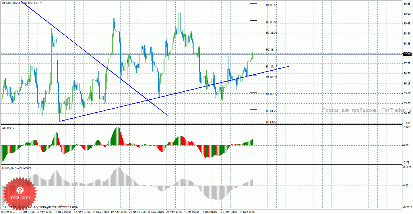 Анализ сырой нефти за 18 декабря показывает, что цена закрепилась выше восходящей линии тренда, таким образом, сейчас инструмент может продолжить восходящее движение. Восходящая линия тренда вновь поддерживает быков и выступает им поддержкой, но закрепление цены ниже нее может быть повторным сигналом к смене тенденции на рынке. Таким образом, сейчас актуальны длинные позиции с целями R2 – 88,11 и R3 – 89,05. Также возможно возобновление нисходящего движения с целями 85,65 и 84,71, но только в случае еще одного закрепления ниже линии тренда. Индикатор Awesome показывает текущее восходящее движение, так как последний закрытый бар зеленого цвета. OsMA также направлен вверх, что говорит о восходящем характере движения и в более долгосрочном плане.