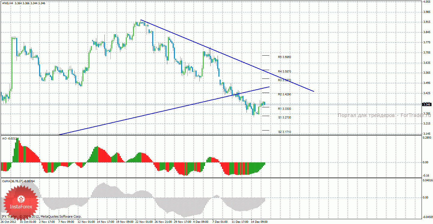 Анализ природного газа за 18 декабря показывает, что цена сохраняет перспективы нисходящего движения, но в понедельник начала корректироваться. Cейчас актуально нисходящее движение с целями 3,2700 и 3,1710, но только в случае закрепления ниже уровня поддержки 3,3300. Целями для начала восходящей коррекции выступают уровни 3,4290 и 3,5270. Восходящая линия тренда больше не поддерживает торгующих на повышение, так как цена закрепилась ниже нее, зато сформировалась новая нисходящая линия тренда, которая уже оказывает поддержку медведям. Индикатор Awesome показывает локальное восходящее движение, последний закрытый бар окрашен в зеленый цвет, что свидетельствует о коррекционном движении. OsMA также направлен вверх, что сигнализирует о восходящем движении цены на газ и в более долгосрочной перспективе, что в сумме с отскоком цены от уровня 3,2700 выглядит весьма логично.