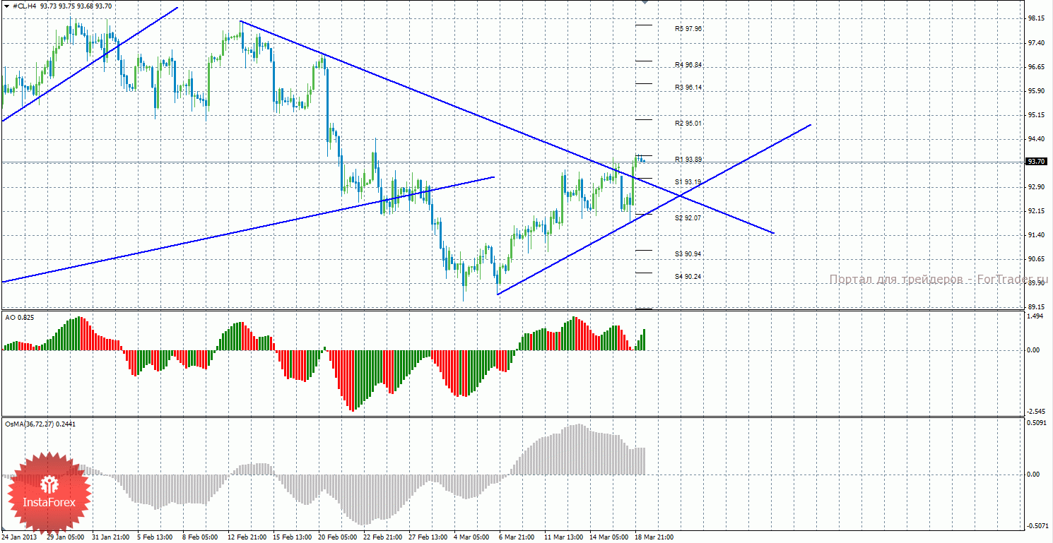 Анализ сырой нефти за 19 марта показывает, что цена закрепилась выше нисходящей линии тренда, поэтому восходящее движение может продолжиться, особенно, при наличии восходящей линии тренда. Нисходящая линия тренда более не поддерживает торгующих на понижение, зато построена новая восходящая линия тренда, которая оказывает поддержку торгующим на повышение. Таким образом, сейчас актуальны длинные позиции с целями R1 – 93,89 и R2 – 95,01. Также возможно начало нисходящего коррекционного движения с целями 93,19 и 92,07, если цена отскочит от уровня 93,89. Индикатор Awesome показывает текущее восходящее движение, так как последний закрытый бар зеленого цвета, что говорит в пользу возможного продолжения восходящего движения. OsMA также направлен вверх, что говорит о восходящем характере движения и в более долгосрочном плане. Если цена отскочит от уровня 93,89, может начаться нисходящая коррекция, а преодоление этого уровня сработает в пользу продолжения восходящего движения.