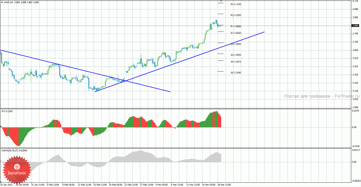 Анализ природного газа за 19 марта показывает, что цена продолжает восходящее движение, которое поддерживается восходящей линией тренда, но может сейчас начать коррекцию. Сейчас актуально восходящее движение с целями 4,0260 и 4,1530, если цена закрепится выше уровня 3,8980. Целями для возможной нисходящей коррекции выступают уровни 3,8200 и 3,6920, если цена останется ниже уровня 3,8980. Восходящая линия тренда оказывает поддержку быкам и не дает цене пока что уйти ниже себя. Индикатор Awesome показывает локальное нисходящее движение, последний закрытый бар окрашен в красный цвет, что говорит в пользу начала нисходящей коррекции. OsMA также направлен вниз, что сигнализирует о нисходящем движении цены на газ и в более долгосрочной перспективе. Закрепление цены выше уровня 3,8980 может спровоцировать возобновление восходящего трендового движения. Если цена закрепится ниже восходящей линии тренда, то на рынке произойдет смена тенденции на нисходящую.