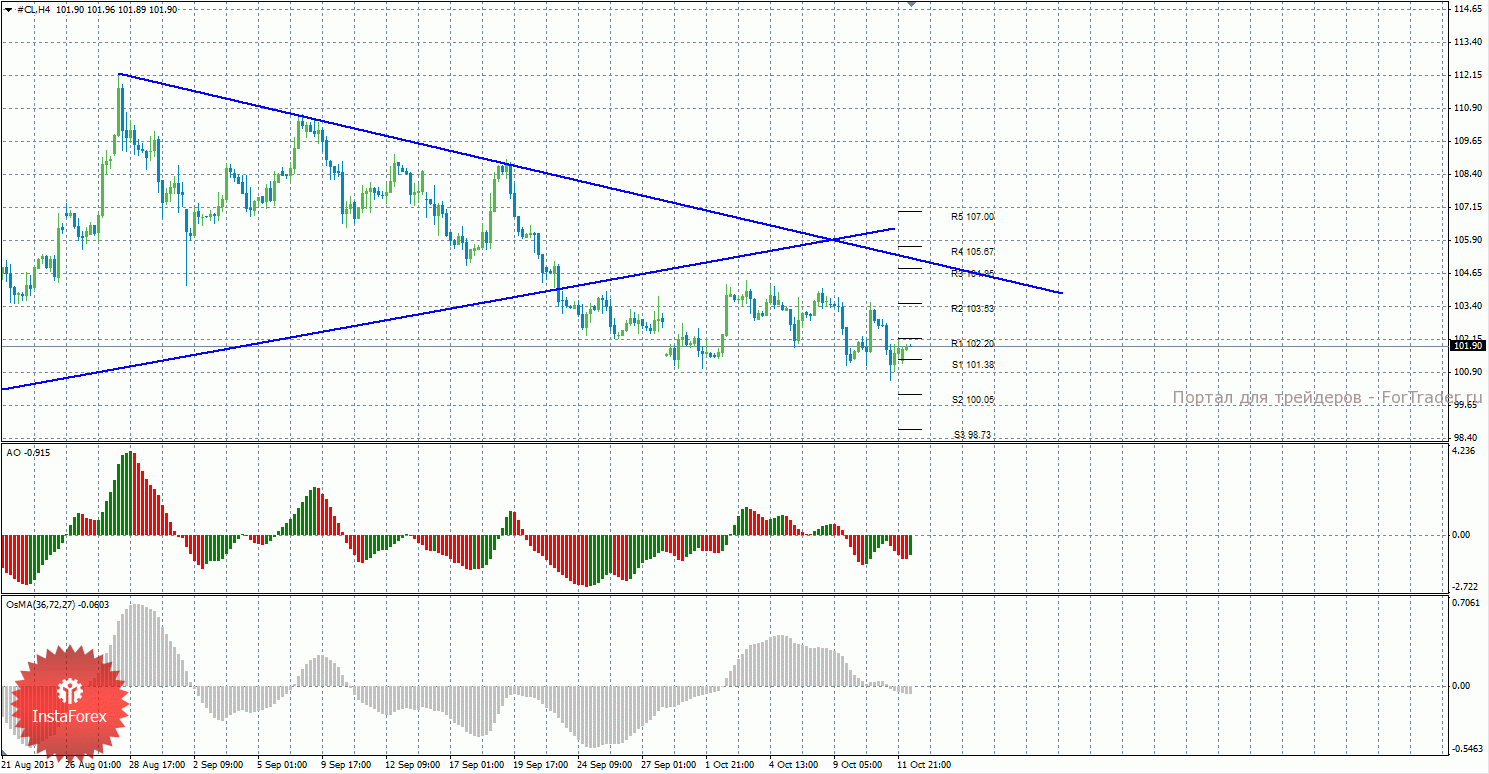 Анализ сырой нефти за 14 октября показывает, что цена начала новый виток коррекционного движения, пока что очень слабого, а цена располагается между уровней S1 и R1. Нисходящее движение может продолжиться с целями S2 – 100,05 и S3 – 98,73, если цена закрепится ниже уровня 101,38. Может также продолжиться восходящая коррекция с целями 102,20 и 103,53, в случае, если цена останется выше уровня 101,38. Долгосрочная восходящая линия тренда больше не оказывает поддержку восходящему движению, цена закрепилась ниже нее, а тенденция на рынке поменялась на нисходящую. Построена нисходящая линия тренда, которая сейчас является актуальной и оказывает поддержку торгующим на понижение. Индикатор Awesome показывает текущее нисходящее движение, так как последний закрытый бар красного цвета. OsMA также направлен вниз, что говорит о нисходящем характере движения и в более долгосрочном плане. Закрепление ниже уровня 101,38 может спровоцировать возобновление нисходящего движения.