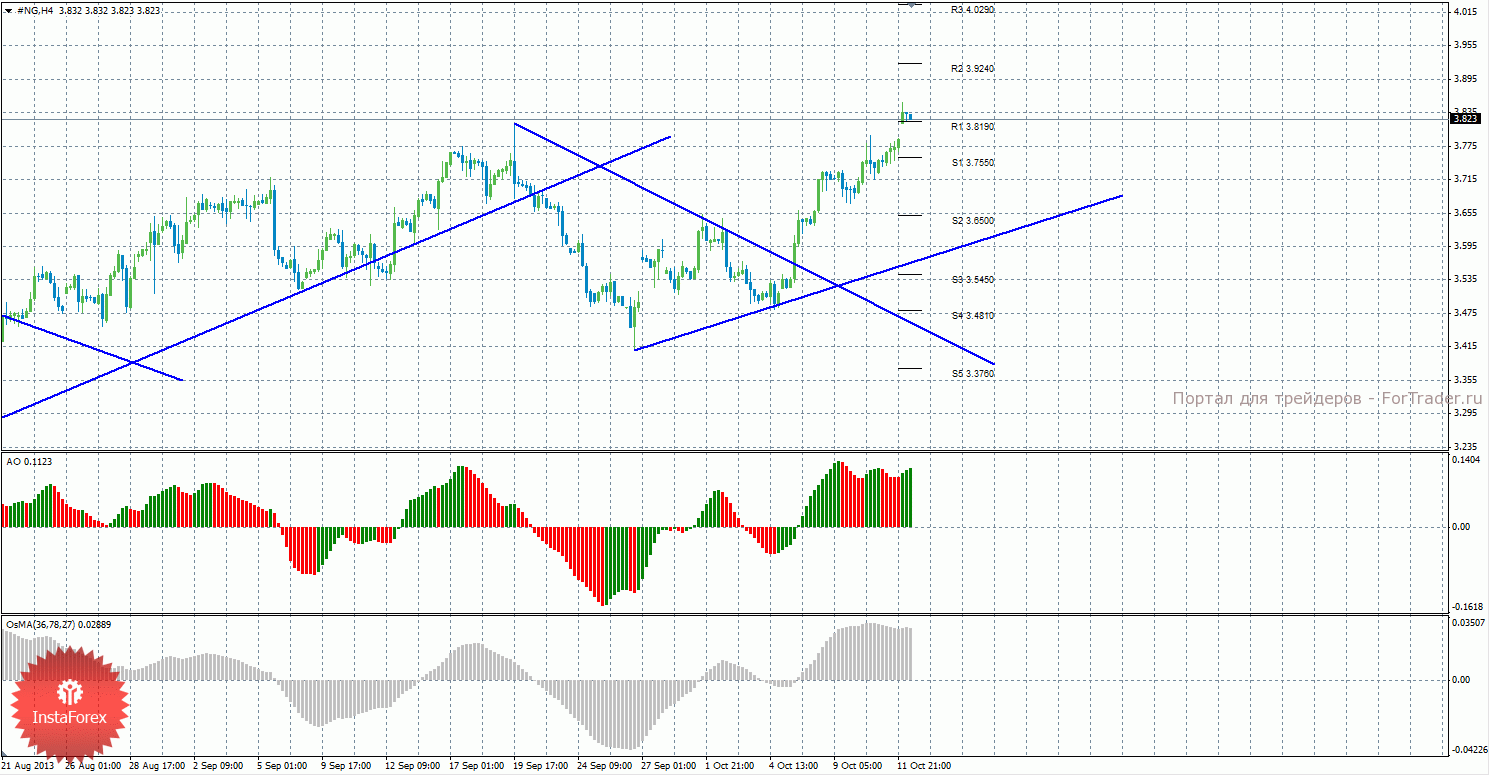 Анализ природного газа за 14 октября показывает, что цена закрепилась выше уровня 3,8190, а любой из индикаторов может начать разряжаться в любой момент времени. На данный момент актуально восходящее движение с целями уровни сопротивления R2 — 3,9240 и R3 – 4,0290, если цена останется выше уровня 3,8190. Целями для возможного начала нисходящей коррекции выступают уровни 3,7550 и 3,6500, если цена закрепится ниже уровня 3,8190. Построена новая восходящая линия тренда, которая сейчас поддерживает торгующих на повышение, но цена находится довольно далеко от нее. Индикатор Awesome показывает локальное восходящее движение, последний закрытый бар окрашен в зеленый цвет. OsMA же направлен вниз, что сигнализирует о нисходящем движении цены на газ в более долгосрочной перспективе. Закрепление ниже уровня 3,8190 может спровоцировать новый виток коррекции. OsMA разряжается, а Awesome может начать разряжаться в ближайшее время.