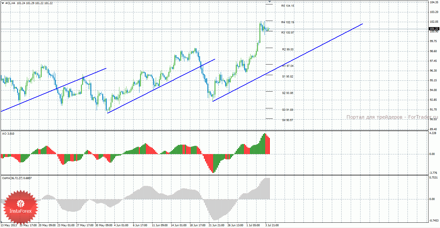 Анализ сырой нефти за 4 июля показывает, что цена продолжает сильное восходящее движение и закрепилась выше уровня сопротивления R3, также построена восходящая линия тренда. Сейчас актуальны длинные позиции с целями R4 – 102,19 и R5 – 104,15, если цена останется выше уровня 100,97. Может начаться нисходящее коррекционное движение с целями 99,00 и 97,04, если цена закрепится ниже уровня 100,97. Построена восходящая линия тренда, которая оказывает поддержку торгующим на повышение, однако, она сейчас находится достаточно далеко от цены. Индикатор Awesome показывает текущее нисходящее движение, так как последний закрытый бар красного цвета. OsMA же направлен вверх, что говорит о восходящем характере движения в более долгосрочном плане. Отскок от уровня сопротивления 100,97 может спровоцировать продолжение восходящего движения.