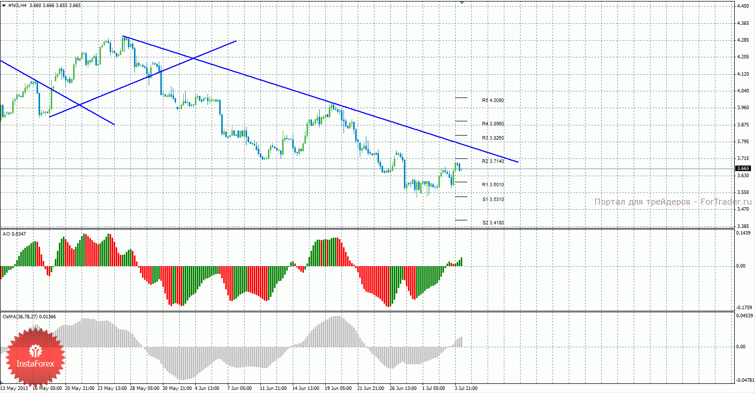 Анализ природного газа за 4 июля показывает коррекционное движение к нисходящей линии тренда, и Awesome, и OsMA направлены вверх, сигнализируя о коррекции. Сейчас актуально движение вниз с целями уровни поддержки R1 — 3,6010 и S1 — 3,5310, если цена отскочит от уровня 3,7140. Целями для возможного продолжения восходящего коррекционного движения выступают уровни 3,7140 и 3,8260. Нисходящая линия тренда оказывает поддержку торгующим на понижение. Индикатор Awesome показывает локальное восходящее движение, последний закрытый бар окрашен в зеленый цвет – коррекция продолжается. OsMA также направлен вверх, что сигнализирует о восходящем движении цены на газ и в более долгосрочной перспективе. Если цена отскочит от уровня 3,7140, это может засвидетельствовать возобновление нисходящего движения.