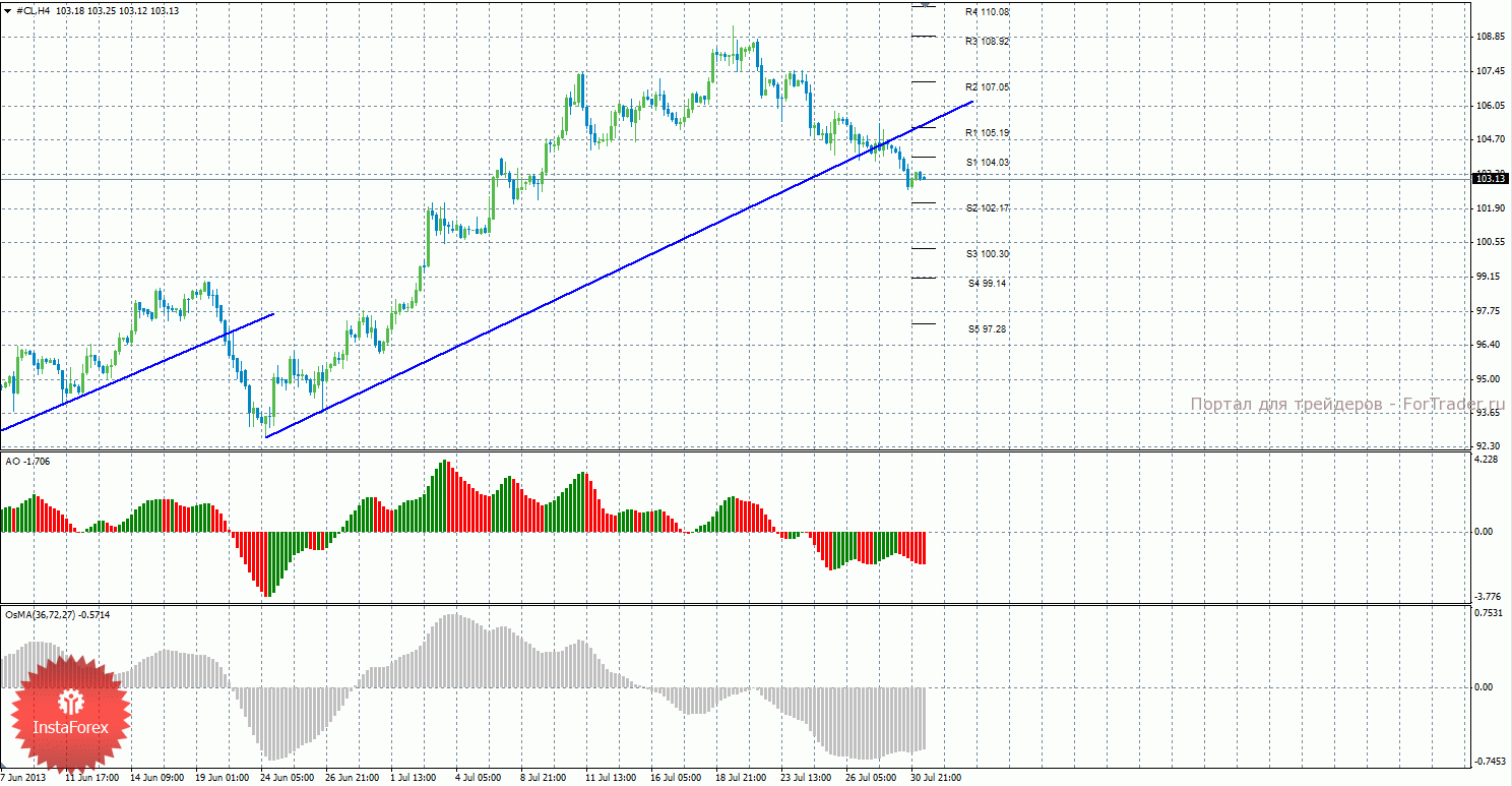 Анализ сырой нефти за 31 июля показывает, что цена закрепилась ниже восходящей линии тренда, поэтому сейчас тенденция на рынке поменялась на нисходящую и актуальны короткие позиции. Сейчас рекомендуется рассматривать ордера на продажу с целями S2 – 102,07 и S3 – 100,30, если цена останется ниже уровня 104,03. Может также начаться восходящее коррекционное движение с целями 104,03 и 105,19, если цена отскочит от уровня 102,07. Восходящая линия тренда больше не оказывает поддержку торгующим на повышение, новую нисходящую линию тренда построить пока что нельзя. Индикатор Awesome показывает текущее нисходящее движение, так как последний закрытый бар красного цвета. OsMA же развернулся наверх, что говорит о восходящем характере движения в более долгосрочном плане. OsMA сейчас разряжается, в любую минуту может начать разряжаться и Awesome.