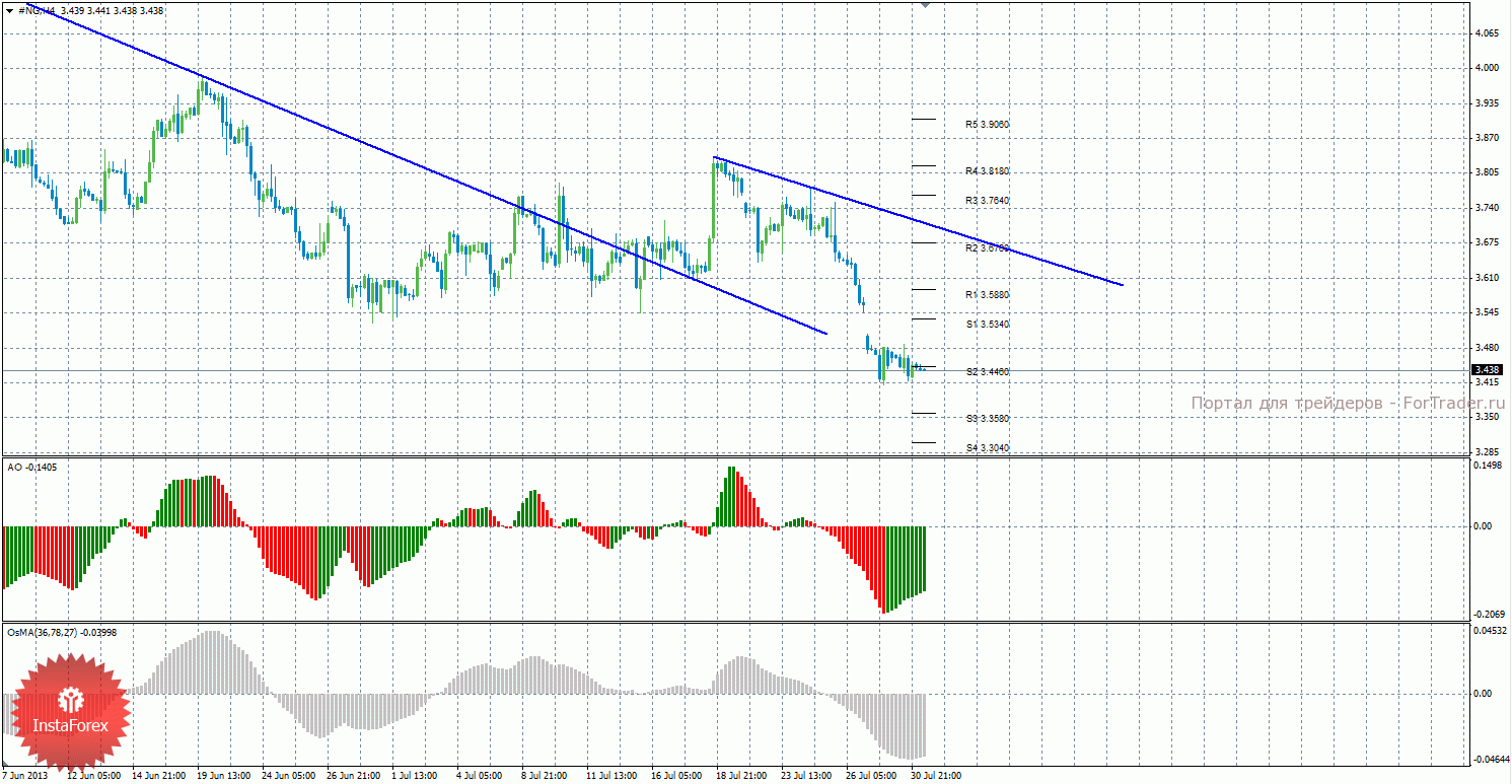 Анализ природного газа за 31 июля показывает, что цена продолжает нисходящее движение, однако, из-за замедления темпов нисходящего движения оба индикатора начали разряжаться. Сейчас актуально движение вниз с целями уровни поддержки S2 — 3,4460 и S3 — 3,3580, первый из которых отработан. Целью для возможного начала восходящей коррекции выступают уровни 3,5340 и 3,5880, если цена отскочит от уровня 3,4460. Новая нисходящая линия тренда оказывает поддержку торгующим на понижение. Индикатор Awesome показывает локальное восходящее движение, последний закрытый бар окрашен в зеленый цвет. OsMA также развернулся наверх, что сигнализирует о восходящем движении цены на газ и в более долгосрочной перспективе. Если цена отскочит от уровня 3,4460, может начаться виток восходящей коррекции.
