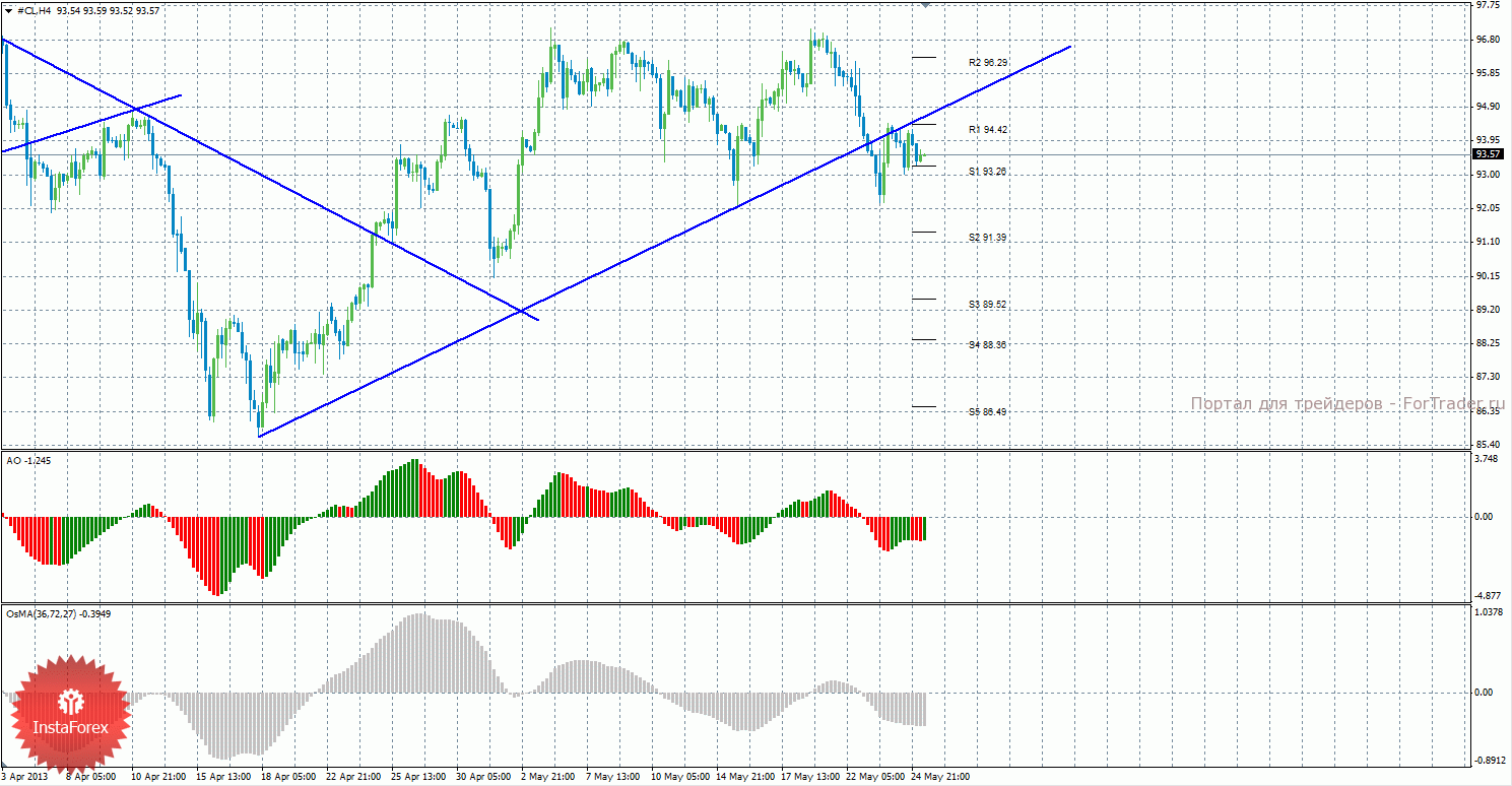 Анализ сырой нефти за 27 мая показывает, что цена закрепилась ниже восходящей линии тренда и сразу скорректировалась обратно к трендовой линии и на данный момент находится между уровнями S1 и R1. На данный момент актуальны короткие позиции с целями S2 – 91,39 и S3 – 89,52, если цена закрепится ниже уровня 93,26. Может также продолжиться восходящая коррекция с целями 94,42 и 96,29, если цена останется выше уровня 93,26. Восходящая линия тренда больше не поддерживает торгующих на повышение, так как цена закрепилась ниже нее. Индикатор Awesome показывает текущее нисходящее движение, так как последний закрытый бар красного цвета. OsMA же направлен вниз, что говорит о нисходящем характере движения в более долгосрочном плане. Если цена закрепится ниже уровня 93,26, это может просигнализировать о возобновлении нисходящего движения.
