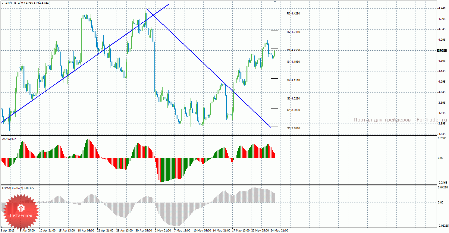 Анализ природного газа за 27 мая показывает, что цена продолжает находиться выше нисходящей линии тренда, а восходящее движение с небольшими откатами продолжается. Сейчас актуально восходящее движение с целями 4,3410 и 4,4290, если цена закрепится выше уровня 4,2530. Целями для возможной нисходящей коррекции выступают уровни 4,1990 и 4,1110, если цена останется ниже уровня 4,2530. Нисходящая линия тренда больше не оказывает поддержку медведями, а восходящую линию тренда пока что построить нельзя. Индикатор Awesome показывает локальное нисходящее движение, последний закрытый бар окрашен в красный цвет. OsMA также направлен вниз, что сигнализирует о нисходящем движении цены на газ и в более долгосрочной перспективе. Отскок от уровня 4,2530 может спровоцировать нисходящее коррекционное движение.