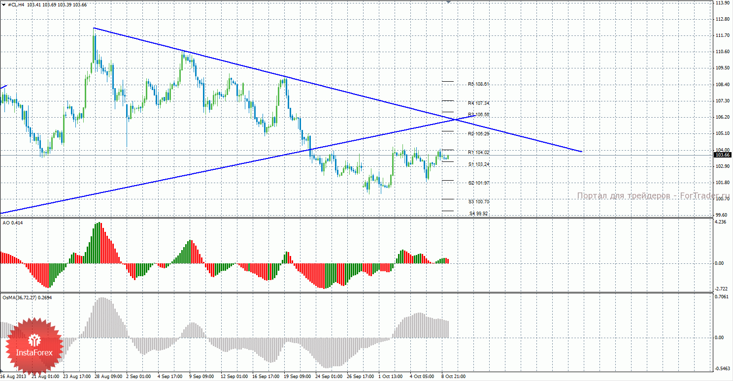 Анализ сырой нефти за 9 октября показывает, что цена отскочила от уровня поддержки 101,97 и продолжает виток восходящего коррекционного движения. Нисходящее движение может возобновиться с целями S2 – 101,97 и S3 – 100,70, если цена закрепится ниже уровня 103,24. Может также продолжиться восходящая коррекция с целями 104,02 и 105,29, в случае, если цена останется выше уровня 103,24. Долгосрочная восходящая линия тренда больше не оказывает поддержку восходящему движению, цена закрепилась ниже нее, а тенденция на рынке поменялась на нисходящую. Построена нисходящая линия тренда, которая сейчас является актуальной и оказывает поддержку торгующим на понижение. Индикатор Awesome показывает текущее нисходящее движение, так как последний закрытый бар красного цвета. OsMA также направлен вниз, что говорит о нисходящем характере движения и в более долгосрочном плане. Если цена закрепится ниже уровня 103,24, это может спровоцировать возобновление нисходящего движения.
