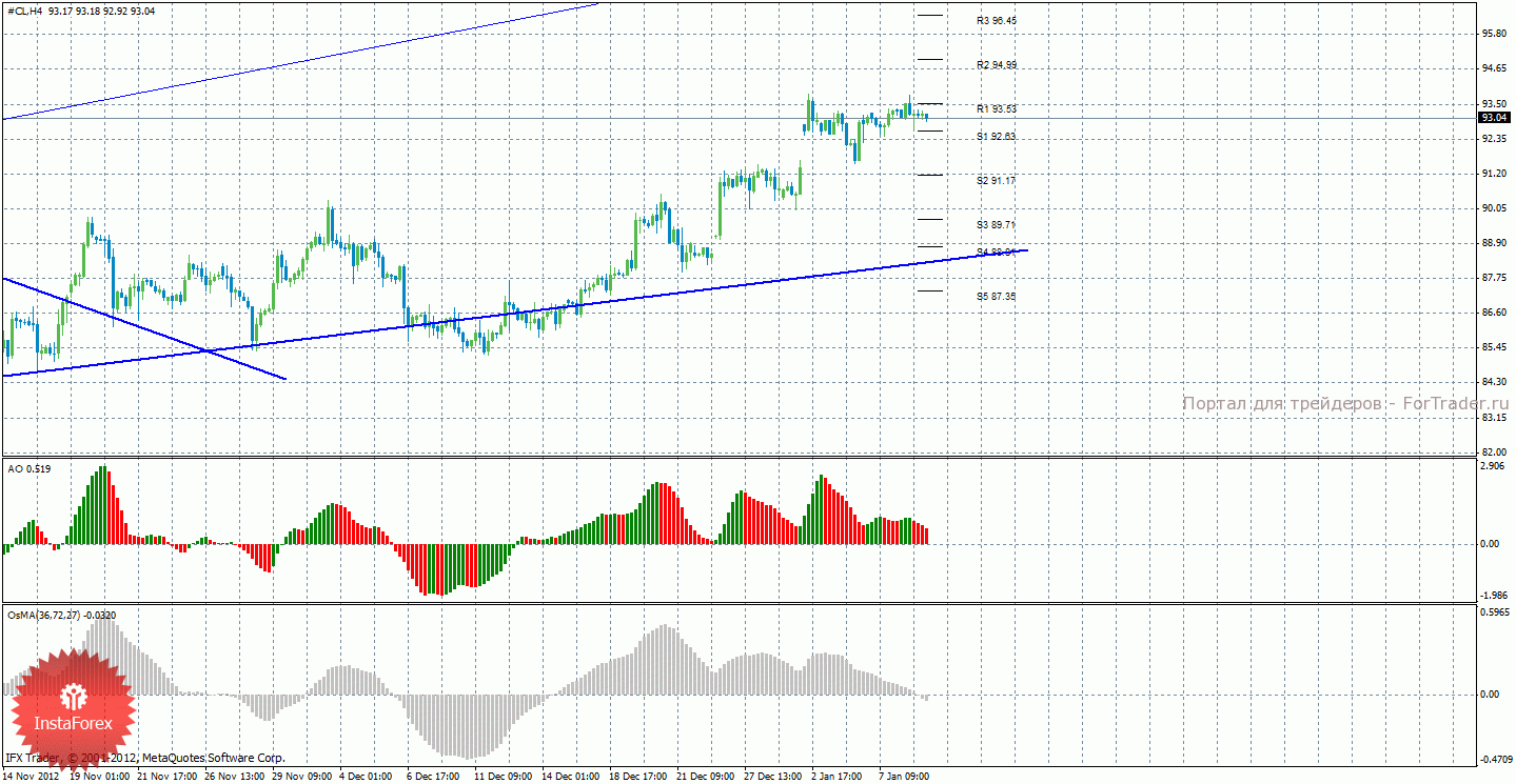 В ходе проведенного анализа движения цены на нефть, можно сделать вывод, что сейчас можно рассматривать длинные позиции с целями 94,99 и 96,45, но только, если цена закрепиться выше уровня 93,53. Стоп-лосс выставляем ниже ближайшего уровня поддержки. При заходе сделки в прибыльность в безубыток. Разворот Awesome или OsMA наверх засвидетельствует возможное возобновление восходящего движения, также как и закрепление выше уровня 93,53, но начинать торговлю все же лучше после закрепления выше 93,53. Короткие позиции сейчас рассматривать не рекомендуется.