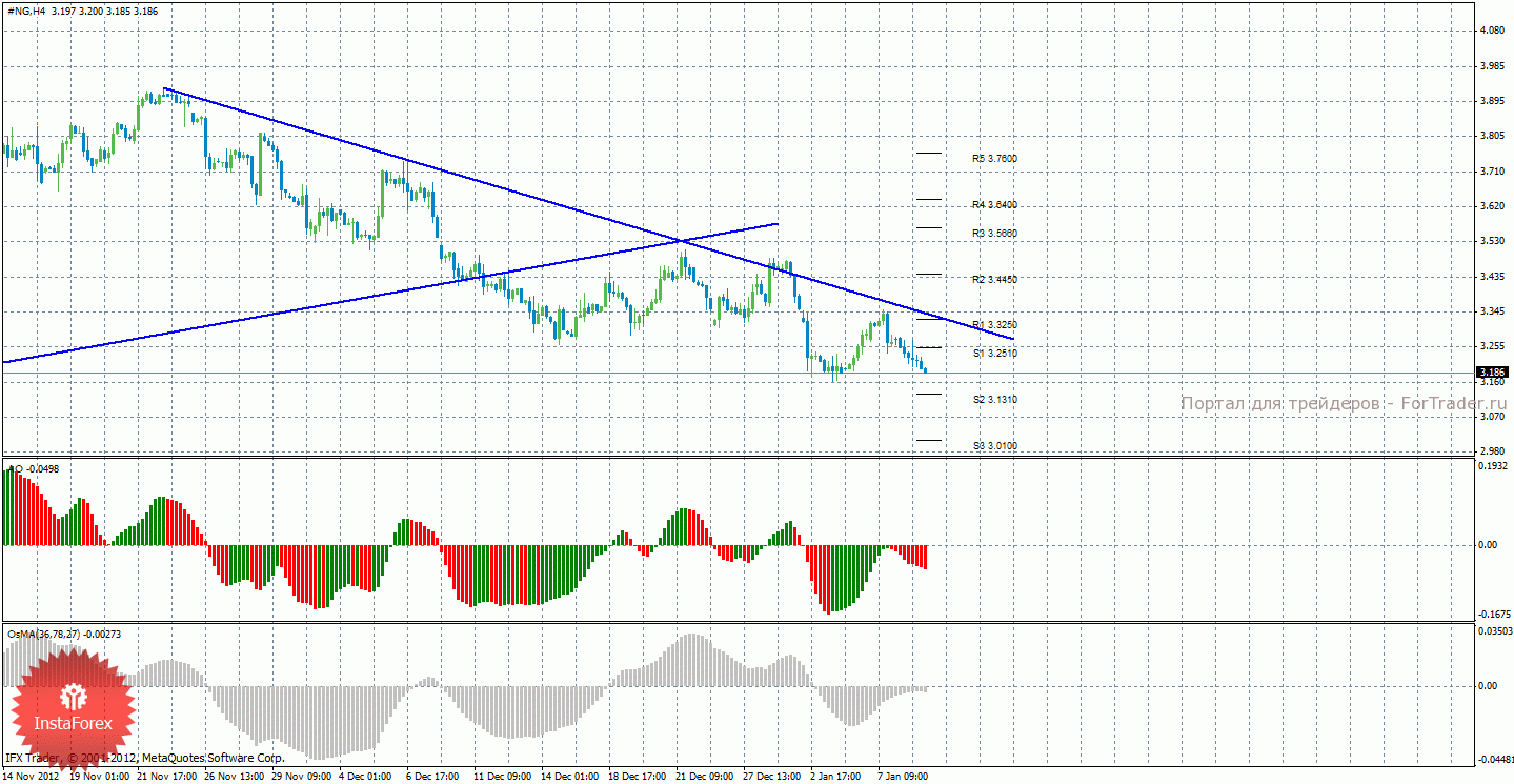 Анализ природного газа за 9 января показывает, что цена возобновила нисходящее движение, закрепившись ниже уровня S1 – 3,2510, индикаторы также поддерживают нисходящий тренд. Таким образом, сейчас актуально нисходящее движение с целями 3,1310 и 3,0100. Целями для возможной восходящей коррекции выступают уровни 3,2510 и 3,3250, которая станет актуальной, если цена отскочит от уровня 3,1310. Нисходящая линия тренда по-прежнему поддерживает торгующих на понижение, так как цена располагается ниже нее. Индикатор Awesome показывает локальное нисходящее движение, последний закрытый бар окрашен в красный цвет. OsMA также развернулся вниз, что сигнализирует о продолжении нисходящего движения цены на газ и в более долгосрочной перспективе.