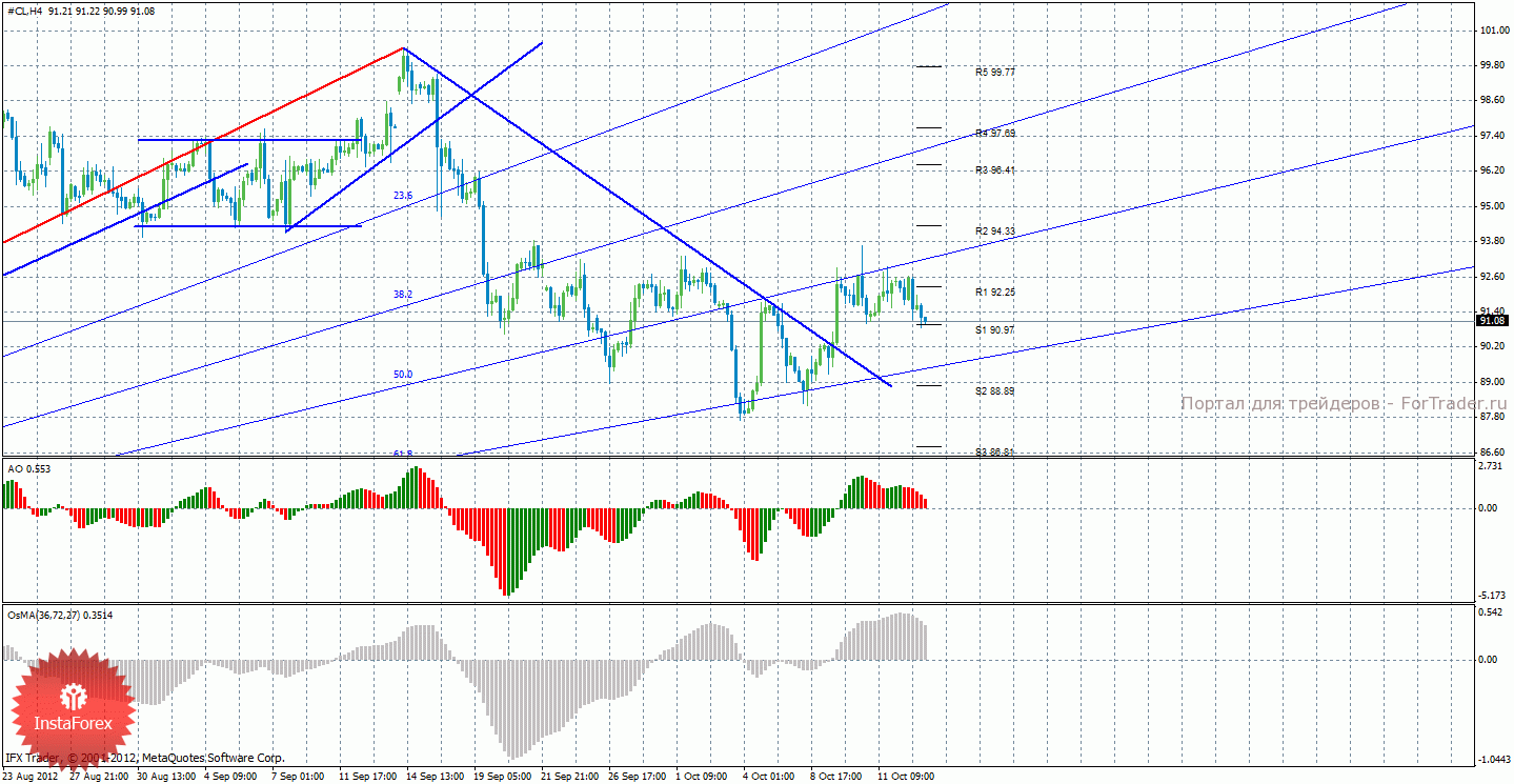 Анализ сырой нефти за 15 октября показывает, что цена находится выше нисходящей линии тренда, поэтому сейчас может продолжаться восходящее движение. Нисходящая линия тренда более не актуальна, так как цена закрепилась выше нее, а значит восходящее движение имеет хорошие перспективы. Новой восходящей линии тренда пока нет. Восходящее движение может продолжиться с целями 94,33 и 96,41, но для этого нужно закрепление цены выше 92,25. Закрепление цены ниже уровня R1 будет сигнализировать о начале нисходящей коррекции с целями 88,89 и 86,81. Индикатор Awesome показывает текущее нисходящее движение, так как последний закрытый бар красного цвета. OsMA также направлен вниз, что говорит о нисходящем характере движения и в более долгосрочном плане.