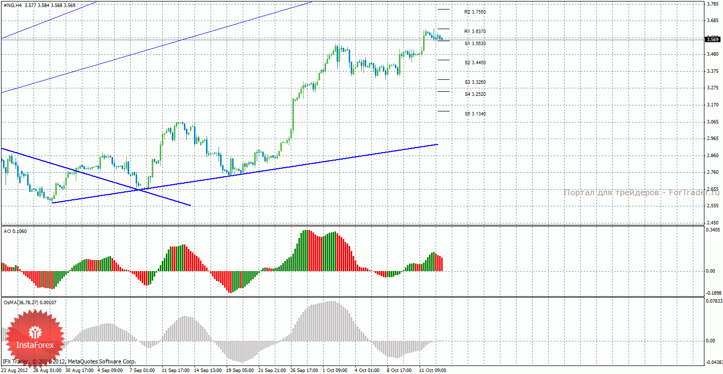 Анализ природного газа за 15 октября показывает, что цена продолжает восходящее движение, но сейчас находится между уровней S1 и R1 – в зоне неопределенности. Целями для продолжения восходящего движения сейчас выступают 3,7550 и 3,8740, но для из отработки требуется закрепление цены выше уровня 3,6370. Отскок цены ниже уровня S1 – 3,5630 укажет на начало коррекции с целями 3,4450 и 3,3260. Новая восходящая линия тренда поддерживает торгующих на повышение, но у нее достаточно малый угол наклона и цена довольно далеко от нее находится, хотя и слабой ее назвать нельзя. Индикатор Awesome показывает локальное нисходящее движение, последний закрытый бар окрашен в красный цвет. OsMA же направлен наверх, что сигнализирует о восходящем движении цены на газ в более долгосрочной перспективе.