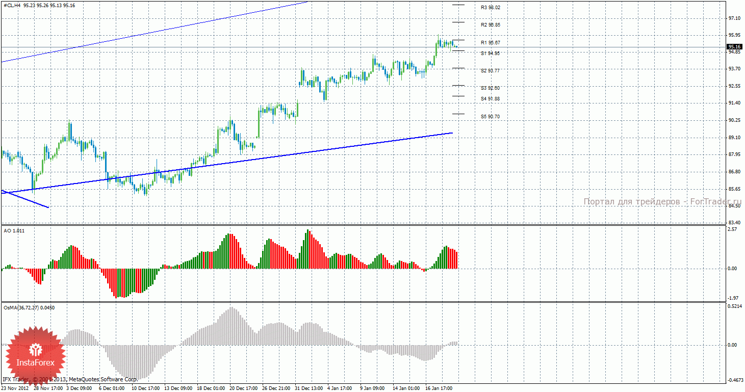 Анализ сырой нефти за 21 января показывает, что цена всю пятницу не двигалась с места, а сейчас находится между уровнями S1 и R1 и не определилась еще с направлением торгов на этой неделе. Восходящая линия тренда продолжает поддерживать быков и выступает поддержкой восходящему движению. Таким образом, сейчас актуальны длинные позиции с целями R2 – 96,85 и R3 – 98,02, но для их открытия требуется закрепление цены выше уровня 95,67. Также возможно начало коррекционного движения с целями 93,77 и 92,60, если цена закрепиться ниже уровня 94,95. Индикатор Awesome показывает текущее нисходящее движение, так как последний закрытый бар красного цвета, что свидетельствует о коррекционном движении. OsMA же направлен наверх, что говорит о восходящем характере движения в более долгосрочном плане. Закрепление цены выше уровня 95,67 может спровоцировать продолжение восходящего движения.
