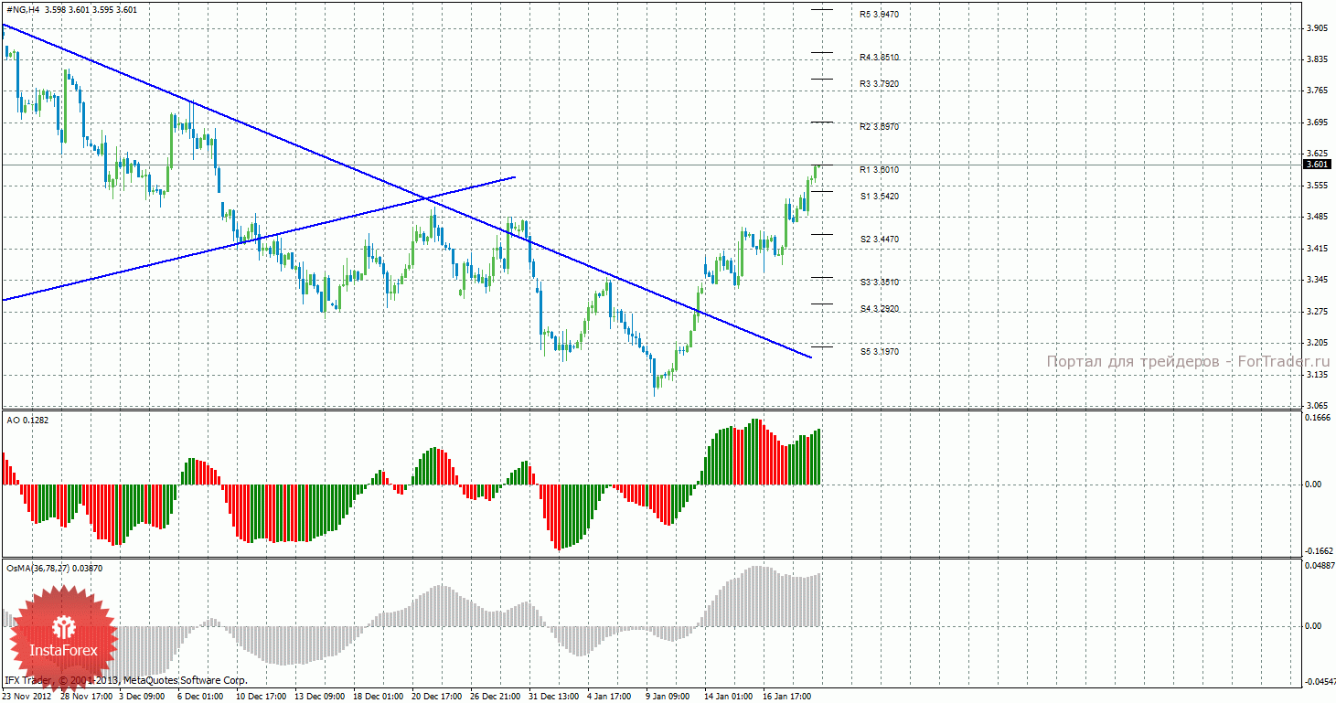 Анализ природного газа за 21 января показывает, что цена отработала уровень сопротивления 3,6010, если закрепиться выше него, то восходящее движение сможет продолжиться. Сейчас актуально восходящее движение с целями 3,6970 и 3,7920, но только выше уровня 3,6010. Целями для возможной нисходящей коррекции выступают уровни 3,5420 и 3,4470, если цена отскочит от уровня 3,6010. Нисходящая линия тренда более не поддерживает медведей, так как цена закрепилась выше нее, а восходящую линию пока что построить не удается. Индикатор Awesome показывает локальное восходящее движение, последний закрытый бар окрашен в зеленый цвет. OsMA также направлен наверх, что сигнализирует о продолжении восходящего движения цены на газ и в более долгосрочной перспективе. Закрепление выше уровня 3,6010 может спровоцировать продолжение восходящего тренда. Оба индикатора сейчас перекуплены, а значит могут начать разряжаться.