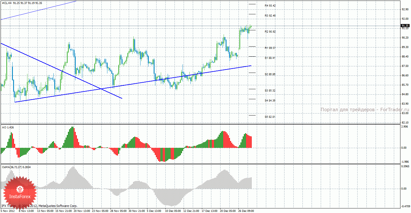 Анализ сырой нефти за 28 декабря показывает, что цена продолжает восходящее движение, закрепилась выше уровня сопротивления R2 – 90,92 и немного сбавила ход. Восходящая линия тренда поддерживает быков и выступает поддержкой восходящему движению. Таким образом, сейчас актуальны длинные позиции с целями R3 – 92,46 и R4 – 93,42. Также возможно начало коррекционного движения с целями 89,37 и 88,41, но только в случае закрепления цены ниже уровня 90,92. Индикатор Awesome показывает текущее нисходящее движение, так как последний закрытый бар красного цвета, что предупреждает о возможном начале коррекции. OsMA направлен вверх, что говорит о восходящем характере движения в более долгосрочном плане. Закрепление ниже уровня 90,92 может спровоцировать начало коррекции.