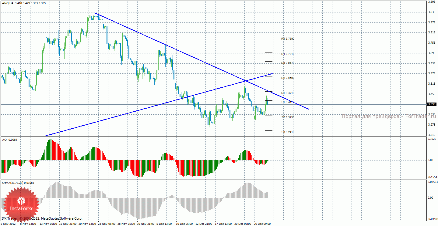 Анализ природного газа за 28 декабря показывает, что цена начала корректироваться, но при этом располагается ниже линии тренда, чем сохраняет перспективы нисходящего движения. Cейчас актуально нисходящее движение с целями 3,3290 и 3,2410, а отскок от уровня 3,4170 может подтвердить эти намерения. Целями для восходящей коррекции выступают уровни 3,4170 и 3,4710. Восходящая линия тренда больше не поддерживает торгующих на повышение, так как цена закрепилась ниже нее, зато нисходящая линия тренда оказывает поддержку медведям. Индикатор Awesome показывает локальное восходящее движение, последний закрытый бар окрашен в зеленый цвет, что свидетельствует о коррекции. OsMA также развернулся вверх, что сигнализирует о продолжении восходящего движения цены на газ и в более долгосрочной перспективе. В случае отскока от уровня 3,4170 может возобновиться нисходящее движение.
