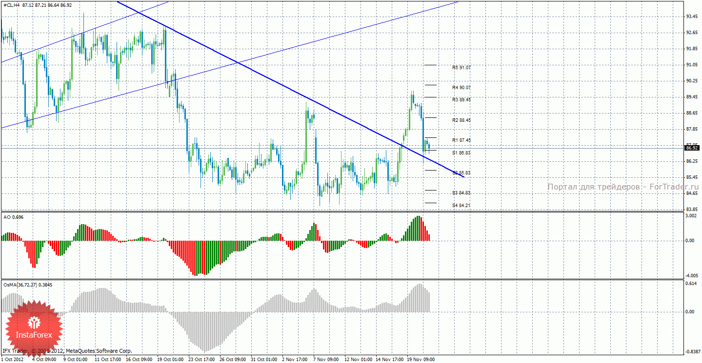 Анализ сырой нефти за 21 ноября показывает, что цена закрепился выше нисходящей линии тренда, но сейчас продолжает корректироваться обратно к линии тренда. Нисходящая линия тренда более не поддерживает медведей и не актуальна, новой восходящей линии тренда пока что нет. Таким образом, актуальны длинные позиции с целями R2 – 88,45 и R3 – 89,45, но для этого теперь требуется закрепление цены выше уровня 87,45. Также возможно продолжение коррекционного движения с целями 86,83 и 85,83. Индикатор Awesome показывает текущее нисходящее движение, так как последний закрытый бар красного цвета, коррекция продолжается. OsMA также направлен вниз, что говорит о нисходящем характере движения и в более долгосрочном плане.