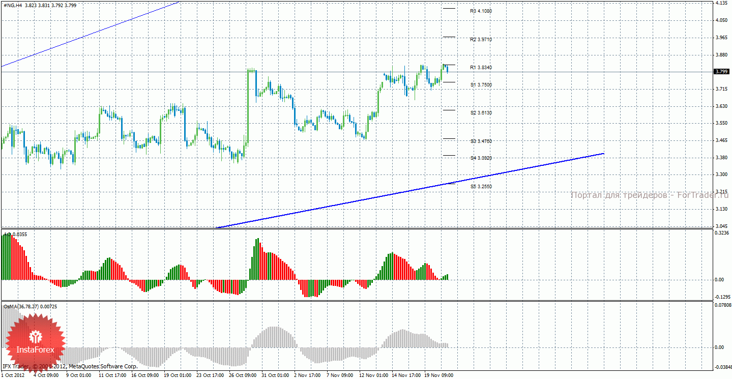 Анализ природного газа за 21 ноября показывает, что цена находится пока что между уровнями S1 и R1, поэтому все еще не определилась с направлением торгов на этой неделе. Таким образом, сейчас актуально восходящее движение с целями 3,9710 и 4,1080, но после закрепления цены выше уровня 3,8340. Определить начало (продолжение) коррекции можно будет по отскоку цены от уровня 3,8340 или закреплению цены ниже 3,7500, в этом случае целями для коррекции будут выступать уровни 3,6130 и 3,4760. Восходящая линия тренда по-прежнему поддерживает торгующих на повышение, у нее достаточно малый угол наклона и цена довольно далеко от нее находится, однако, но и слабой ее по-прежнему назвать нельзя. Индикатор Awesome показывает локальное восходящее движение, последний закрытый бар окрашен в зеленый цвет, но уровень 3,8340 остается не преодоленным. OsMA же направлен вниз, что сигнализирует о нисходящем движении цены на газ в более долгосрочной перспективе.