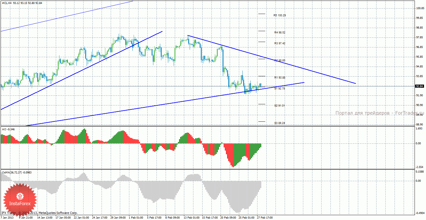 Анализ сырой нефти за 28 февраля показывает, что цена отработала вторую линию тренда, но никак не может закрепиться ниже нее, поэтому может начаться или продолжиться восходящая коррекция. Первая восходящая линия тренда более не поддерживает торгующих на повышение, поэтому сейчас может продолжиться нисходящее движение. Построена также новая нисходящая линия тренда, но цена располагается довольно далеко от нее. Таким образом, сейчас актуальны короткие позиции с целями S2 – 91,01 и S3 – 89,24, но пока что этому мешает вторая восходящая линия тренда. Также возможно продолжение восходящего коррекционного движения с целями 93,88 и 95,65, если цена закрепится выше уровня 92,78. Индикатор Awesome показывает текущее восходящее движение, так как последний закрытый бар зеленого цвета, это говорит в пользу начала восходящей коррекции. OsMA также направлен наверх, что говорит о восходящем характере движения и в более долгосрочном плане. Если цена закрепится ниже второй линии тренда, нисходящее движение может продолжиться.