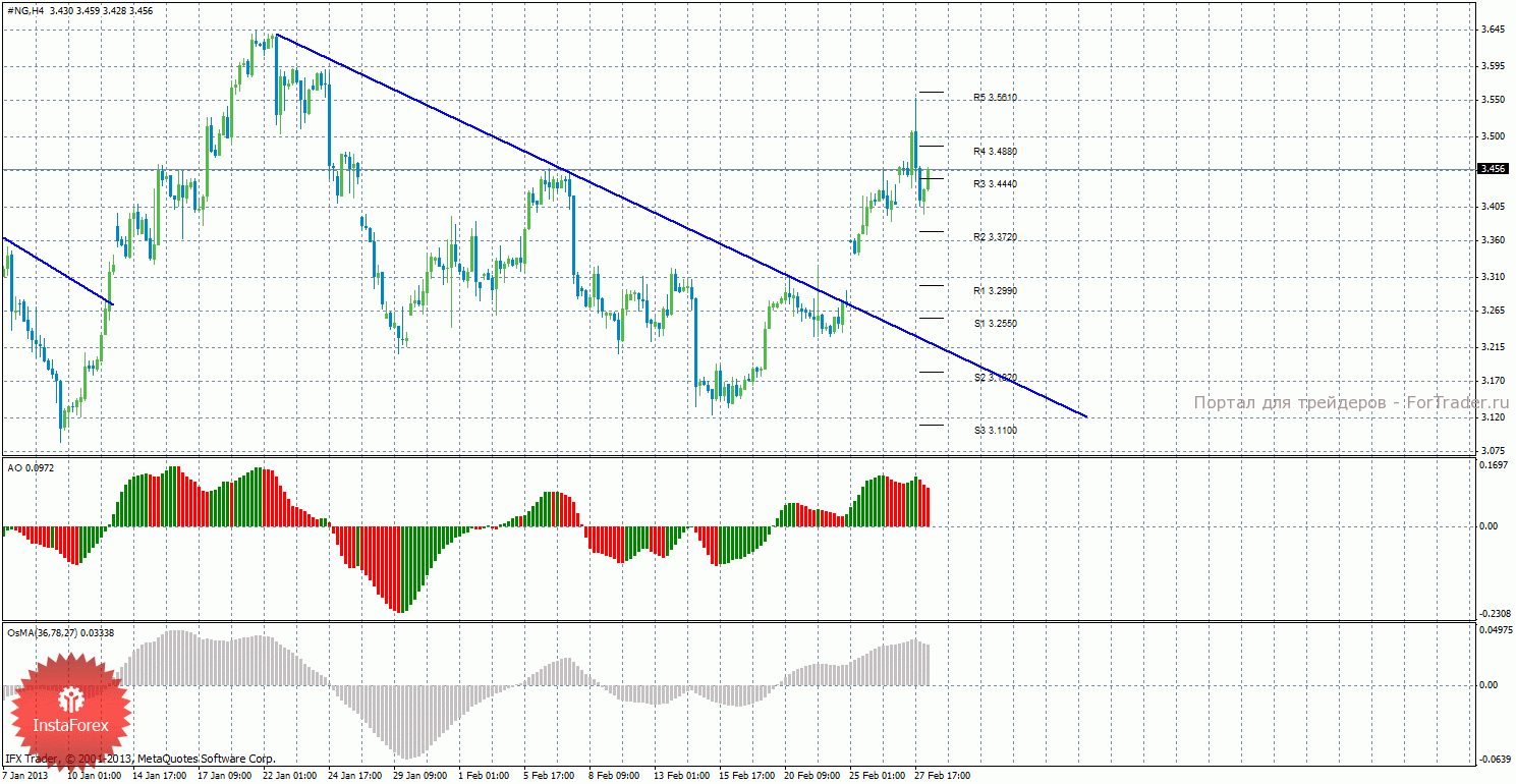 Анализ природного газа за 28 февраля показывает, что цена вчера скорректировалась и закрепилась ниже уровня R3 – 3,4440, но сейчас может возобновиться восходящее движение. Сейчас актуально восходящее движение с целями 3,4880 и 3,5610, если цена закрепится обратно выше уровня R3 — 3,4440. Целями для продолжения нисходящей коррекции выступают уровни 3,3720 и 3,2990, если цена останется ниже уровня 3,4440. Нисходящая линия тренда больше не поддерживает медведей, а новой восходящей линии тренда пока что нет. Индикатор Awesome показывает локальное нисходящее движение, последний закрытый бар окрашен в красный цвет, что говорит в пользу нисходящей коррекции. OsMA также развернулся вниз, что сигнализирует о нисходящей коррекции цены на газ и в более долгосрочной перспективе. Если цена закрепится выше уровня сопротивления 3,4440, то может вновь возобновиться восходящий тренд.