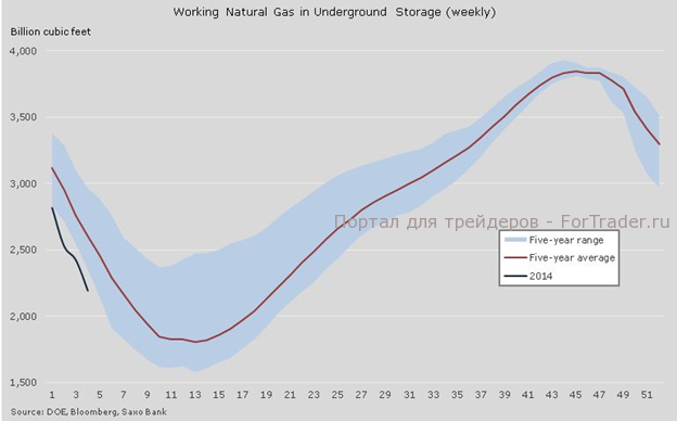 После непрерывного роста цен на природный газ на протяжении первой половины января на рынке возобновились сильные колебания, после которых многим трейдерам пришлось зализывать раны. Трижды за эту неделю диапазон дневной торговли достигал 12%, в результате чего волатильность достигла 100%. Два дня подряд цена держалась в районе 5,5 долларов за терм, но затем быстро опустилась ниже пяти долларов. Повышение цен было вызвано резким сокращением запасов в условиях постоянно растущего спроса, учитывая тот факт, что объемы добычи в этот период года невысокие. Прогнозы потепления в феврале привели к резкому развороту позиций, и по контракту NGH4 было зафиксировано самое сильное двухдневное падение цен за период более четырех лет.
