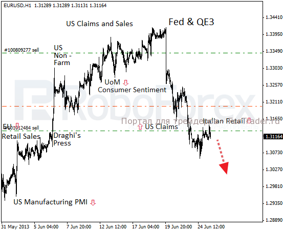 Поэтому пока продолжаю продавать евро. Из новостей дня можно отметить падение ритейла в Италии на 0,1% — показатель падает уже четвёртый месяц подряд. В целом же, выход ФРС из QE3 будет иметь двойной негативный эффект для EUR/USD. Во-первых, поддержку получит доллар. Во-вторых, резко возрастут ставки на долговом рынке, что будет усиливать напряжённость в регионе. Так что текущее падение валютной пары может оказаться лишь предвестником грядущего обвала.