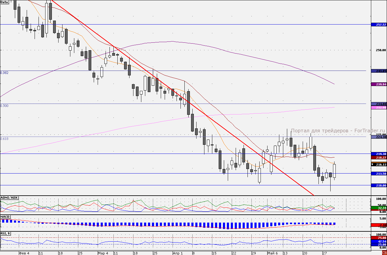Динамику лучше рынка сегодня демонстрируют акции «Роснефти». В первой половине дня бумаги протестировали на прочность 10- дневную скользящую среднюю – 216,0 руб. При сохранении позитивных настроений следующей целью выступит 21- дневная скользящая средняя – 218,28 руб. Судя по показаниям трендовых индикаторов в ближайшее время вполне возможно формирование более существенного отскока, в частности индикатор ADMI/ADX показывает, что на смену «медведям» приходят «быки» (линия «быков» снизу вверх пересекается с линией «медведей»). Однако, несмотря на преобладание позитивных настроений, от ближайших сопротивлений спекулятивные «лонги» все же стоит закрывать, поскольку остудить напор покупателей может ожидаемая во второй половине дня американская статистика. Наш 30-минутный торговый робот пока находится в «лонгах», удерживая длинные позиции от отметки 211,39 руб.