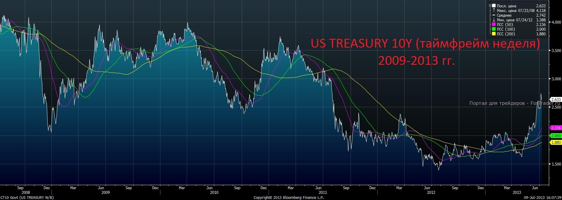 Мы продолжаем видеть рост американских индексов при существенном росте доходностей по американским трежерис, а следовательно напрашивается мысль, что этот рост на рынке акций мнимый и скоро он закончится. Если в ближайшие дни или недели на рынок поступит хоть ещё один существенный намёк на сокращение QE-3, то мы увидим ещё большее давление на американский долговой рынок и как следствие распродажу облигаций и рост доходностей. Если доходности по тем же 10-леткам пробью отметку в 3%, то коррекция на американских рынках последует незамедлительно. Тот факт, что доходность в последние дни особо не спадает, лишний раз подтверждает зарождение негативных ожиданий.