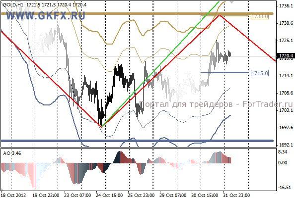 Цены на золото пробили сформировавшийся треугольник в нужную сторону, поэтому у нас уже небольшой плюс. Нужно установить стоп в безубыток. Цели все еще остаются на уровне 1733/35. Формация по золоту остается повышающая, все идет по плану. По дневному сценарию цены запаздывают на пару дней. На часовом графике индикатор АО в положительной зоне, так что в полнее вероятен рывок к цели. Кому невтерпеж, можно частично зафиксироваться.