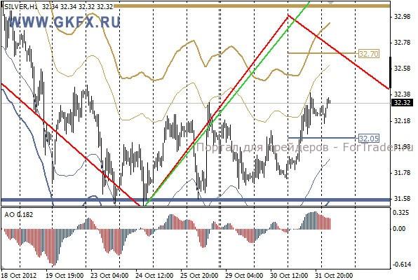 По серебру ситуация подобная, покупка вышла в плюс, нетерпеливым можно зафиксировать часть прибыли. Нужно поставить стоп в безубыток, чтобы ограничить убытки. На часовом графике индикатор АО в положительной зоне, так что в полнее вероятен рывок к цели. Цель на уровне 33,00.