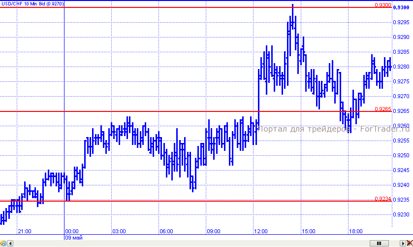 С потерями по отношению к доллару завершил среду и швейцарский франк. Первую половину торговых суток цены удерживались в пределах узкого диапазона 0,2934 – 0,2965. В дальнейшем им удалось преодолеть его верхнюю границу и в рамках восходящего движения они «прокололи» сопротивление 0,9300, от которого начали откат к уровню 0,9260. К завершению дня пара вернулась к 0,9280.