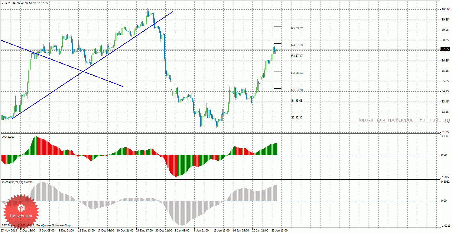Анализ сырой нефти за 24 января показывает, что цена продолжает восходящее коррекционное движение и преодолела уровень сопротивления 97,17. Нисходящее движение может возобновиться с целями R2 – 95,83 и R1 – 94,50, если цена закрепится ниже уровня 97,17. Может продолжиться восходящая коррекция с целями 97,99 и 99,32, в случае, если цена останется выше уровня 97,17. Восходящая линия тренда больше не оказывает поддержку торгующим на повышение, цена закрепилась ниже нее, а тенденция на рынке поменялась на нисходящую. Нисходящей линии тренда пока что нет. Индикатор Awesome показывает текущее восходящее движение, так как последний закрытый бар зеленого цвета. OsMA также направлен вверх, что говорит о восходящем характере движения и в более долгосрочном плане. Отскок от уровня 97,99 может спровоцировать завершение витка коррекционного движения.