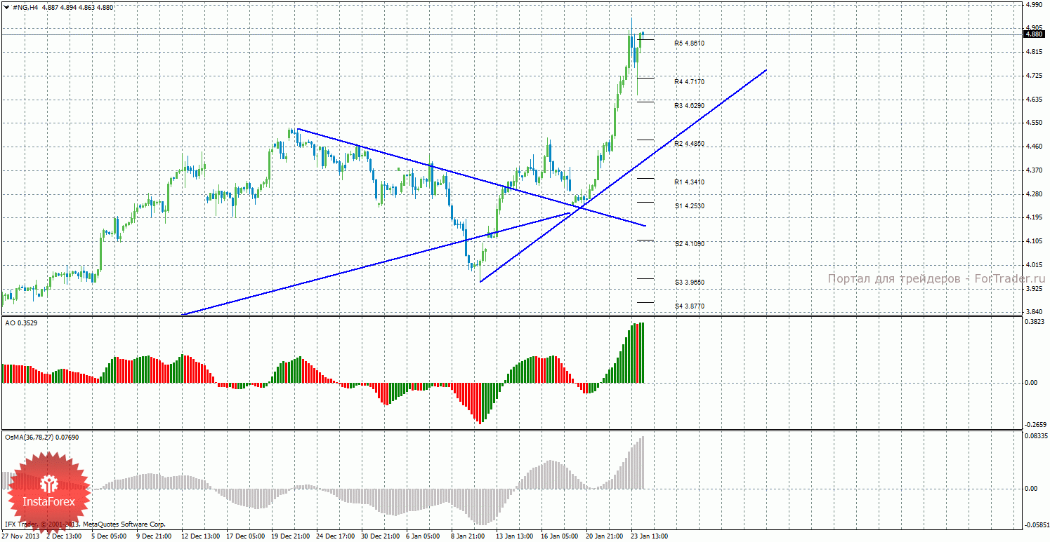 Анализ природного газа за 24 января показывает, что цена продолжает сильное восходящее движение и преодолела последний уровень сопротивления, построена новая восходящая линия тренда. На данный момент актуально восходящее движение, но целей больше нет. Целями для возможного начала нисходящей коррекции выступают уровни поддержки 4,7170 и 4,6290, если цена закрепится ниже уровня 4,8610. Построена восходящая линия тренда, которая оказывает поддержку торгующим на повышение. Индикатор Awesome показывает локальное восходящее движение, последний закрытый бар окрашен в зеленый цвет. OsMA направлен вверх, что сигнализирует о восходящем движении цены на газ и в более долгосрочной перспективе. Если цена закрепится ниже уровня 4,8610, это может спровоцировать виток нисходящей коррекции.