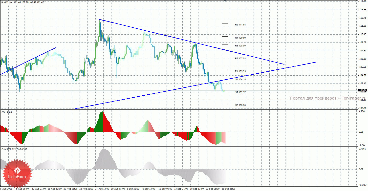 Анализ сырой нефти за 26 сентября показывает, что цена преодолела восходящую линию тренда и продолжает нисходящее движение, отработав уровень поддержки 102,37. Нисходящее движение может продолжиться с целями S3 – 100,60 и S4 – 99,50, если цена закрепится ниже уровня 102,37. Может также начаться восходящее коррекционное движение с целями 104,15 и 105,25, если цена отскочит от уровня 102,37. Долгосрочная восходящая линия тренда больше не оказывает поддержку восходящему движению, цена закрепилась ниже нее, а тенденция на рынке поменялась на нисходящую. Построена нисходящая линия тренда, которая сейчас является актуальной. Индикатор Awesome показывает текущее нисходящее движение, так как последний закрытый бар красного цвета. OsMA же направлен вверх, что говорит о восходящем характере движения в более долгосрочном плане, но, скорее всего, индикатор просто начал разряжаться. Если цена отскочит от уровня 102,37, это может спровоцировать восходящую коррекцию. Awesome также может начать разряжаться в ближайшее время, так как находится на минимальных позициях.