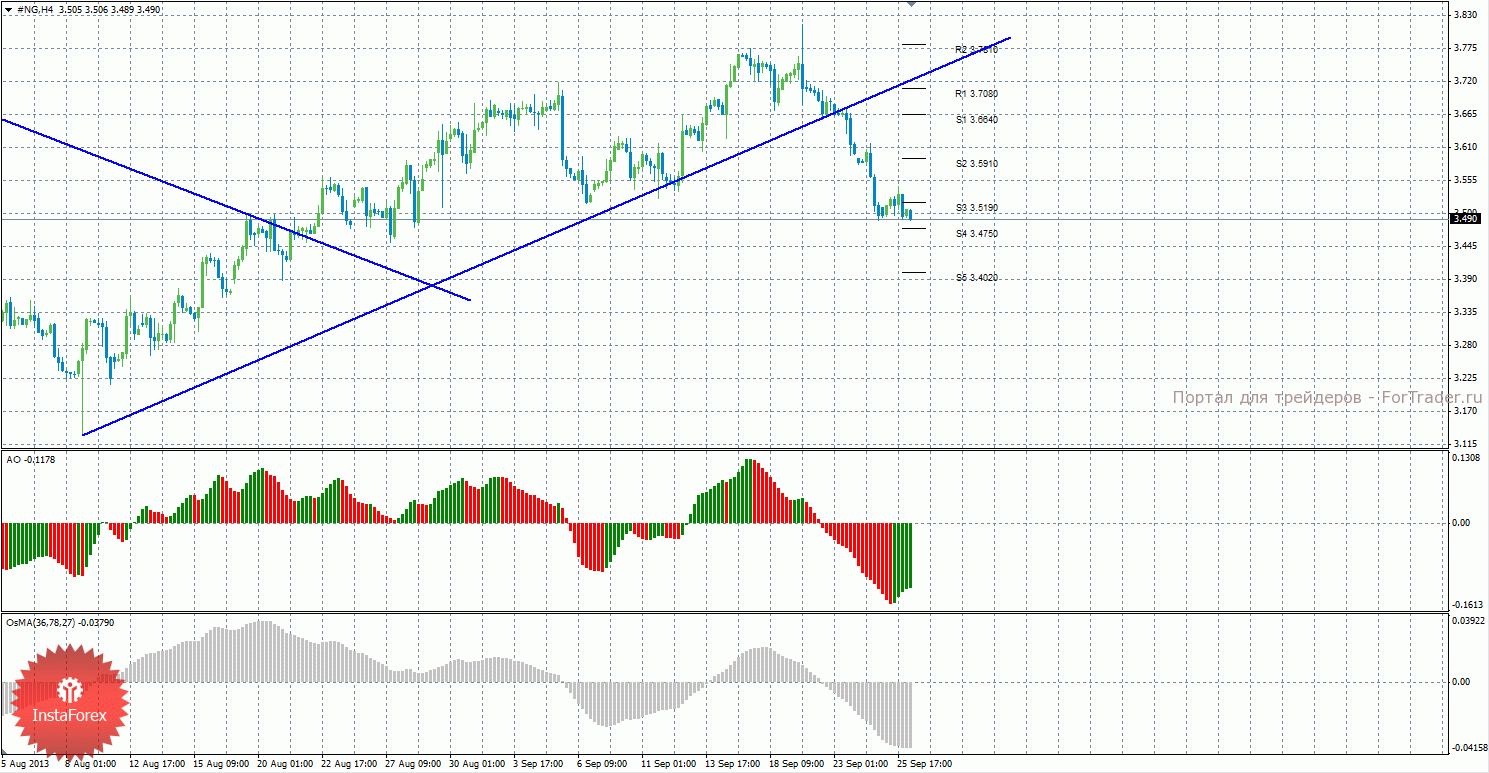 Анализ природного газа за 26 сентября показывает, что цена продолжает нисходящее движение, а вот индикаторы начали разряжаться, так как не могут больше падать. На данный момент актуально нисходящее движение с целями уровни поддержки S4 — 3,4750 и S5 – 3,4020, если цена останется ниже уровня 3,5190. Целями для возможной восходящей коррекции выступают уровни 3,5910 и 3,6640, если цена закрепится выше уровня 3,5190. Восходящая линия тренда перестроена, но цена закрепилась ниже нее, поэтому сейчас тенденция на рынке поменялась на нисходящую. Индикатор Awesome показывает локальное восходящее движение, последний закрытый бар окрашен в зеленый цвет. OsMA же направлен вниз, что сигнализирует о нисходящем движении цены на газ в более долгосрочной перспективе. Если цена закрепится выше уровня 3,5190, это может спровоцировать восходящую коррекцию. Awesome начал разряжаться, а OsMA может начать разрядку уже в ближайшее время.