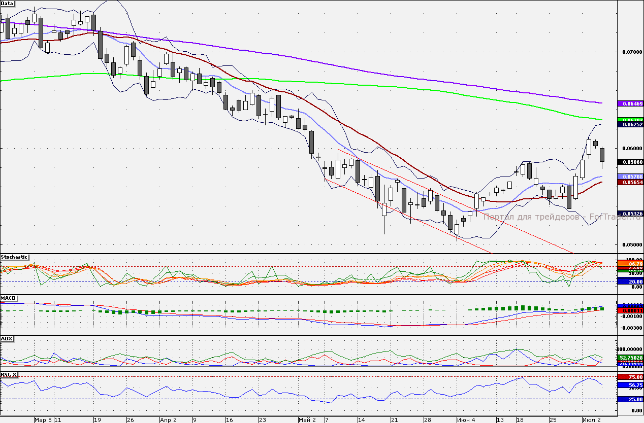 Акции ВТБ могут протестировать 10-дневную скользящую среднюю – 5,708 коп. Сопротивлением является психологическая отметка в 6,0 коп.