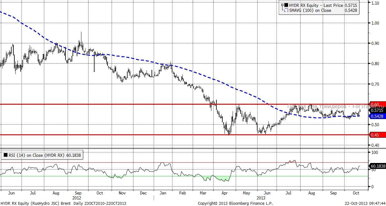 Тестирует ли дно акции энергетической фишки России Русгидро? Этот вопрос сейчас интересует многих. Согласно технической картине, акции еще не перешли в стадию трендового роста. Движение проходит лишь в среднесрочном диапазоне 0,45 – 0,60 руб. за акцию. Как скажут оптимисты, падение прекратилось, и то хорошо. На наш взгляд актив реально дешев, но для покупки время не пришло. Лишь преодолев и закрепившись выше уровня 0,60, актив может быть интересен.