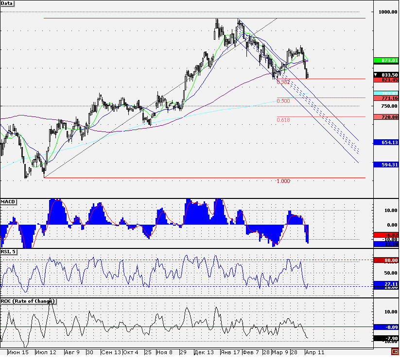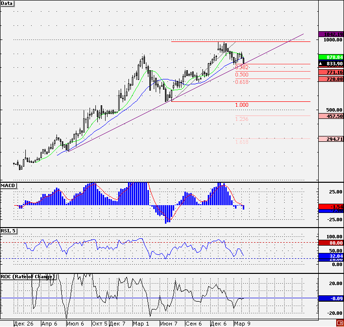 В первой половине сессии акции «Мечела» демонстрировали динамику лучше рынка. Четыре сессии подряд акции эмитента снижались в цене и вчера достигли уровня поддержки на 821,5 руб., от которого был сформирован отскок. Технически бумаги оказались перепроданными, что также способствовало позитивной динамике на старте сегодняшней торговой сессии. Стоит отметить, что указанная выше поддержка является уровнем 38,2% коррекции по Фибоначчи от минимума 20.07.2010 до максимума 13.01.2011. Данный уровень уже тестировался в середине марта текущего года. Если котировкам удастся удержать его вновь, то не исключена попытка реализации «двойного дна» с выходом в район 900 руб. Однако для этого бумагам необходимо будет преодолеть ряд сопротивлений в виде скользящих средних (10-,21- и 100-дневные средние). Напротив, в случае закрепления ниже поддержки на уровне 821,5 руб., снижение может усилиться. Технической целью по бумагам выступит уровень 50% коррекции по Фибоначчи (771,2 руб.). Но на уровне 780 руб. располагается довольно существенная поддержка, усиленная 200-дневной скользящей средней, что в свою очередь может приостановить снижение котировок.