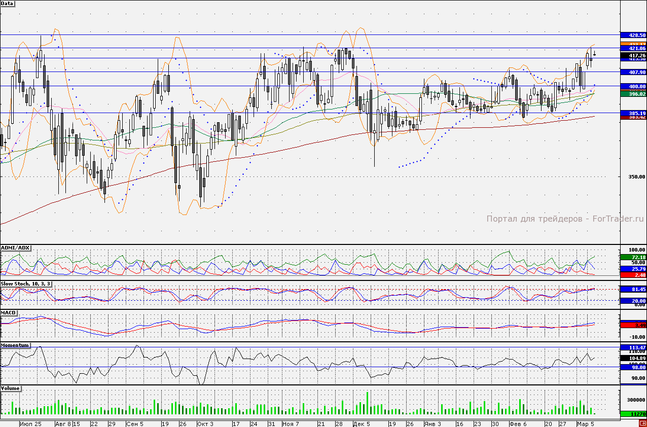 Ближайшие уровни сопротивления: 420,00/421,00/428,50/450,00