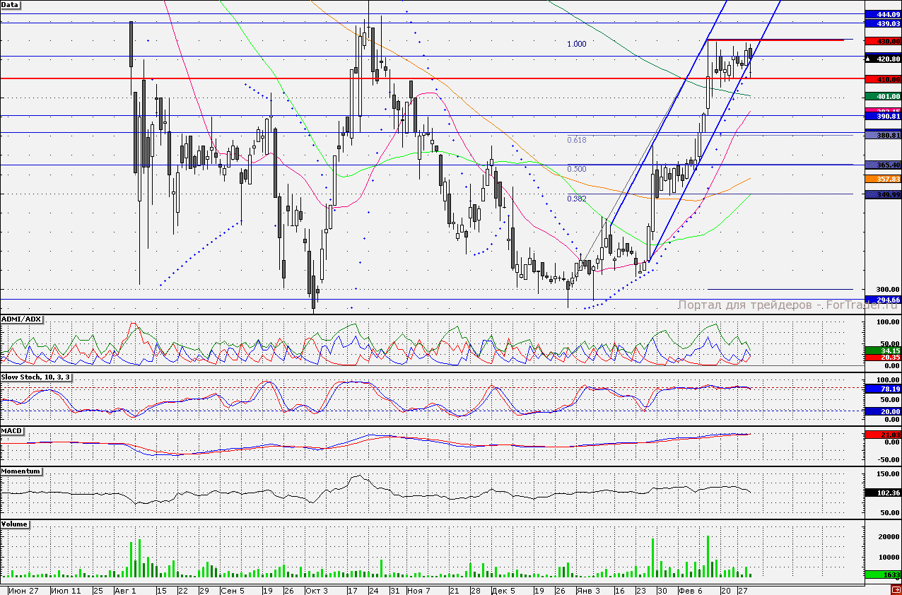 Акции «Соллерса» с конца января торгуются в восходящем канале. Сегодня они тестируют на прочность нижнюю границу восходящего тренда (420 руб.). В пользу прорыва нижней границы восходящего канала свидетельствуют показатели индикаторов. График трендового индикатора Parabolic sar стремится пересечься с графиком акций компании. Трендовый индикатор ADMI/ADX показывает, что напор «быков» значительно ослаб (линия «медведей» стремится пересечься снизу вверх с линией «быков»). Осциллятор Stochastic (10;3;3) свидетельствует о том, что бумаги находятся в зоне перекупленности. В случае, если произойдет прорыв нижней границы канала, то первой технической целью для снижения акций может стать уровень 390 руб. Таким образом, краткосрочным инвесторам я рекомендую продавать с целью снижения до отметки 390 руб. и покупать при закреплении акций выше уровня 430 руб. Данный уровень сдерживал рост в течение нескольких месяцев.