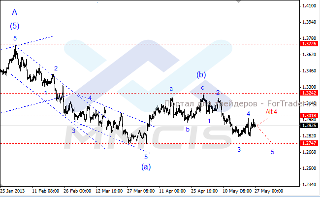 Поэтому в качестве основного сценария на ближайшие дни рассматривается развитие нисходящей динамики в направлении отметки 1.2747 в виде волны «5» нисходящего импульса старшего порядка. Альтернативный сценарий по-прежнему предполагает прорыв уровня 1.30 и тестирование отметки 1.3018 в рамках усложненной структуры волны «Alt:4».