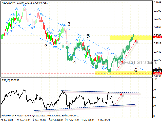 Новозеландец выполнил цели по нисходящей модели с целью 0.7262. Индикатор RSI встретил поддержку в виде восходящей линии тренда, стоит ожидать рост пары nzd usd. Целью роста выступает область 0.7570. Стоп в данном случае прячем ниже 0.7255. Наращивать объем длинных позиций стоит с выходом цены за пределы нисходящего канала.