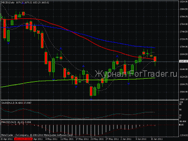 Таким образом, в бумагах СБЕРБАНКА мы ожидаем сильного импульса в движении. Направление движения зависит от того, какую из границ пробьют котировки. Напомним уровни данных границ. Верхняя граница находится на отметке 99,36 рублей за акцию. Нижняя граница находится на отметке 95,53 рубля за акцию. Подведём итоги ещё одного эмитента, который мы рассматривали в прошлом обзоре. Мы говорили:” В целом ГАЗПРОМ копирует поведение котировок СБЕРБАНКА. Пятница также образовала в бумагах компании ГАЗПРОМ модель поглощения. Таким образом, компания ГАЗПРОМ имеет две границы: 1 — 212,46 р., 2 – 206,17 р. Пробитие одной из этих границ укажет дальнейшее направление движения”. Нижняя граница 206,17 р., которую мы указывали в прошлом обзоре, была пробита в четверг 16 июня 2011 года. Ближайшей целью пробития является средняя скользящая с периодом 200 moving average зелёного цвета. Рассмотрим перспективы поведения индекса ММВБ. В четверг котировки остановились на отметке 1671,10 пп. Индекс ММВБ в своём восходящем движении встретил сопротивление 10 июня 2011 года, в роли которого выступает средняя скользящая с периодом 90 moving average синего цвета. После чего котировки индекса ММВБ нашли поддержку в качестве нижней границы белого канала. Таким образом, 17 июня 2011 года индекс ММВБ имеет потенциал к краткосрочному восходящему движению.
