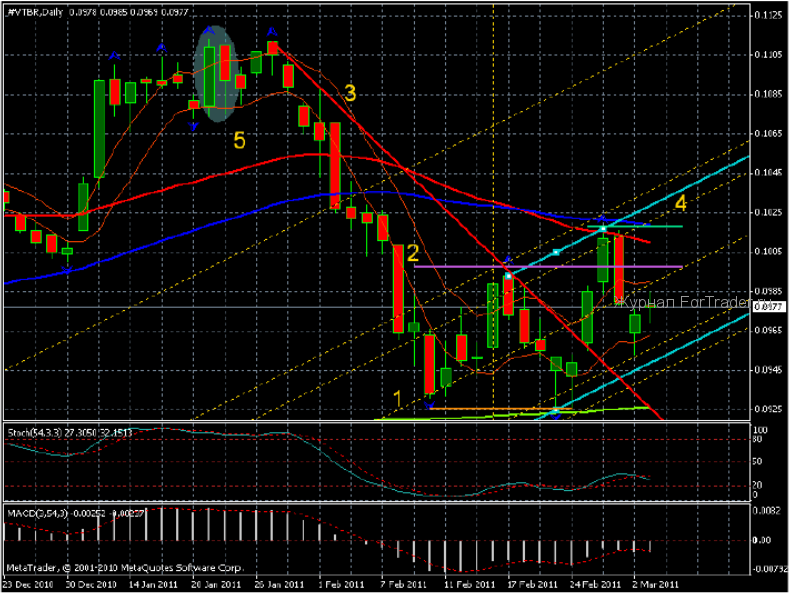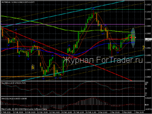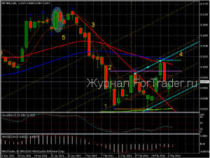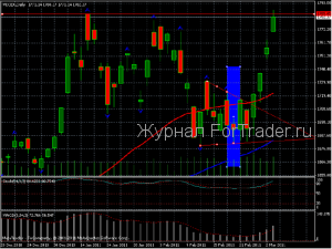 Подведём итоги ещё одного эмитента, который мы рассматривали в прошлом обзоре – компания ГАЗПРОМ. Мы говорили:”Возможны два варианта развития событий. Первый вариант может развить сильное нисходящее движение с целью пробития средней скользящей 200 moving average зелёного цвета. Второй вариант развития событий состоит в следующем: возможен вариант формирования бокового движения в определённых ценовых рамках. После чего стоит ожидать достаточно сильного движения. Направление движения укажет пробитие одной из границ бокового движения. Таким образом, мы имеем два возможных варианта развития ситуации, которые указанны выше” Рассмотрим дневной временной интервал. Отметим, что 20 июня котировки компании сосредоточили своё движение в области средней скользящей с периодом 200 moving average – линия зелёного цвета. Закрытие данной свечи произошло выше произошло ниже нижней границы ценового канала. 21 июня 2011 года котировки компании ГАЗПРОМ вернулись в канал белого цвета. Движение цен в направлении средних скользящих 60 moving average и 90 moving average имело временный характер, так как ранее котировки компании уже протестировали указанные средние скользящие на предмет поддержки. 24 июня 2011 года котировки компании пробили среднюю скользящую зелёного цвета и одновременно нижнюю границу белого канала.