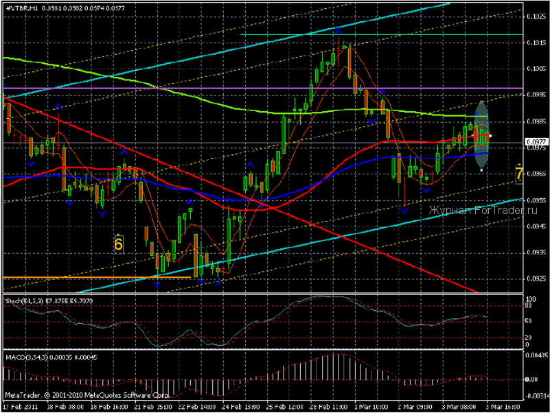 В четверг 23 июня котировки акций в группе ММВБ закрылись на следующих уровнях: ГАЗПРОМ – 195,95 р. (-3,25%), банк ВТБ – 0,08159 р. (-3,03%), Роснефть – 229,42 р. (-1,92%), СевСт– 490,1 р. (-3,30%), Сбербанк – 94,19 р. (-1,62%), РусГидро – 1,3157 р. (-1,81%), ГМКНорНик – 7026 р. (0,00%), Сургутнефтегаз – 26,900 р. (-1,28%), ЛУКОЙЛ – 1720,0 р. (-1,90%), Сбербанк-п — 71,18 р. (-0,20%). Индекс ММВБ – 1607,91 (-1,96%). Подведём итоги прошлого обзора от 20 июня 2011 года. В предыдущем обзоре мы рассматривали банка СБЕРБАНК. Мы говорили: “Таким образом, закрытие второй свечи ниже уровня 95,53 р. подтвердит пробитие нижней границы”. Рассмотрим график с дневным временным интервалом. 20 июня 2011 года дневная свеча закрылась ниже обозначенной границы. Однако в последующий день дневная свеча закрылась выше указанного уровня. Обратим внимание на белый канал. Верхняя граница канала состоит из средней скользящей с периодом 12 и параметром закрытия High. Нижняя граница состоит из средней скользящей с периодом 12 и параметром закрытия LOW. 21 июня 2011 года дневная свеча закрылась внутри канала белого цвета. Необходимо отметить, что 21 июня 2011 года котировки в своём движении встретили уровень поддержки, в качестве которого выступает средняя скользящая 200 moving average – линия зелёного цвета. Средняя скользящая 200 moving average выполняет функцию поддержки после пробития котировками СБЕРБАНКа данного уровня сверху вниз. 21 июня 2011 года мы наблюдаем как цена, едва коснувшись средней скользящей, откатывается назад. 22 июня 2011 года котировки банка устремляются вниз. Следовательно, мы с уверенностью можем сказать, что средняя скользящая зелёного цвета удержала свои позиции в качестве уровня поддержки. Однако котировки 22 июня по-прежнему находились внутри ценового канала белого цвета. Необходимо дождаться пробития нижней границы ценового канала. 23 июня 2011 года котировки пробили нижнюю границу указанного канала и закрылись ниже нижней границы. Данное пробитие является подтверждением нисходящего движения. Таким образом, котировки банка СБЕРБАНК образовали нисходящее движение с целью движения – 92 рубля за акцию.